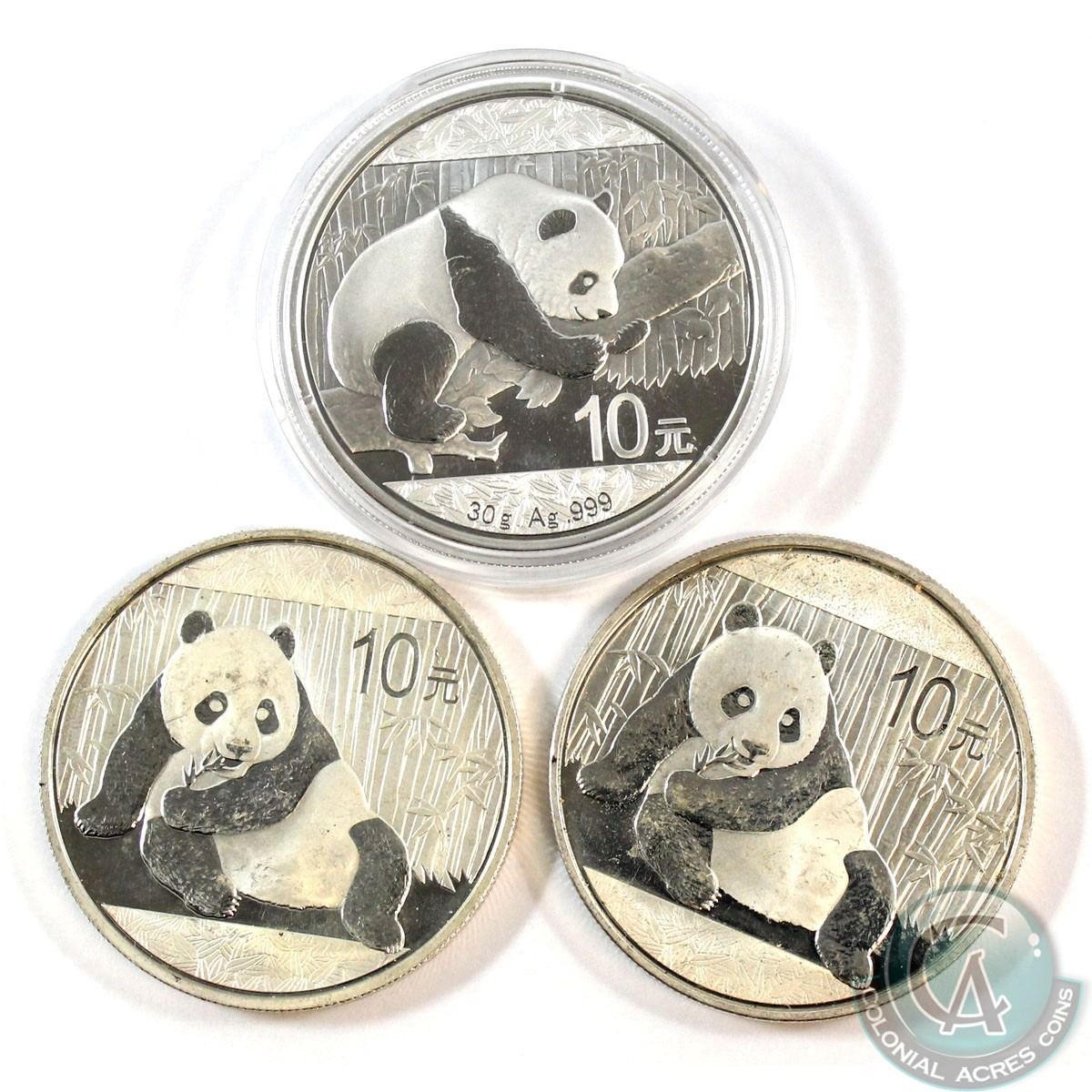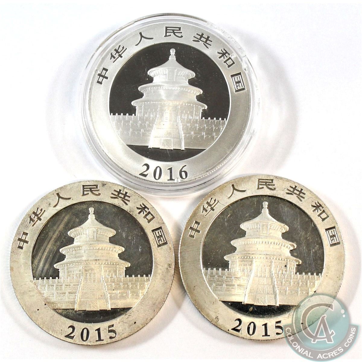 2015 & 2016 China 1oz Fine Silver Pandas (Tax Exempt). Please note coins are toned and capsule is broken. 3pcs