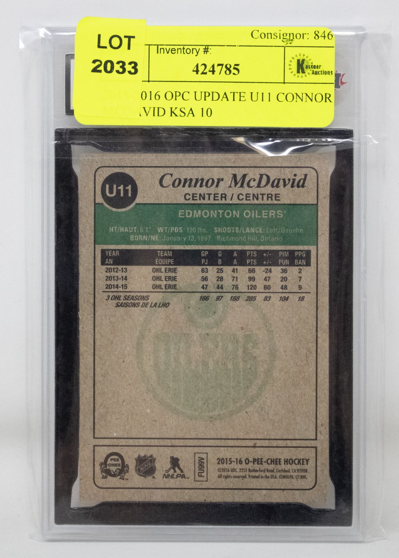 CONNOR MCDAVID ROOKIE CARD, KSA 10. BGS GRADING HAS ZERO 10'S. PSA HAS 114 10'S. *ALL BIDS SUBJECT TO BANK BAILIFF OR OWNERS APPROVAL*