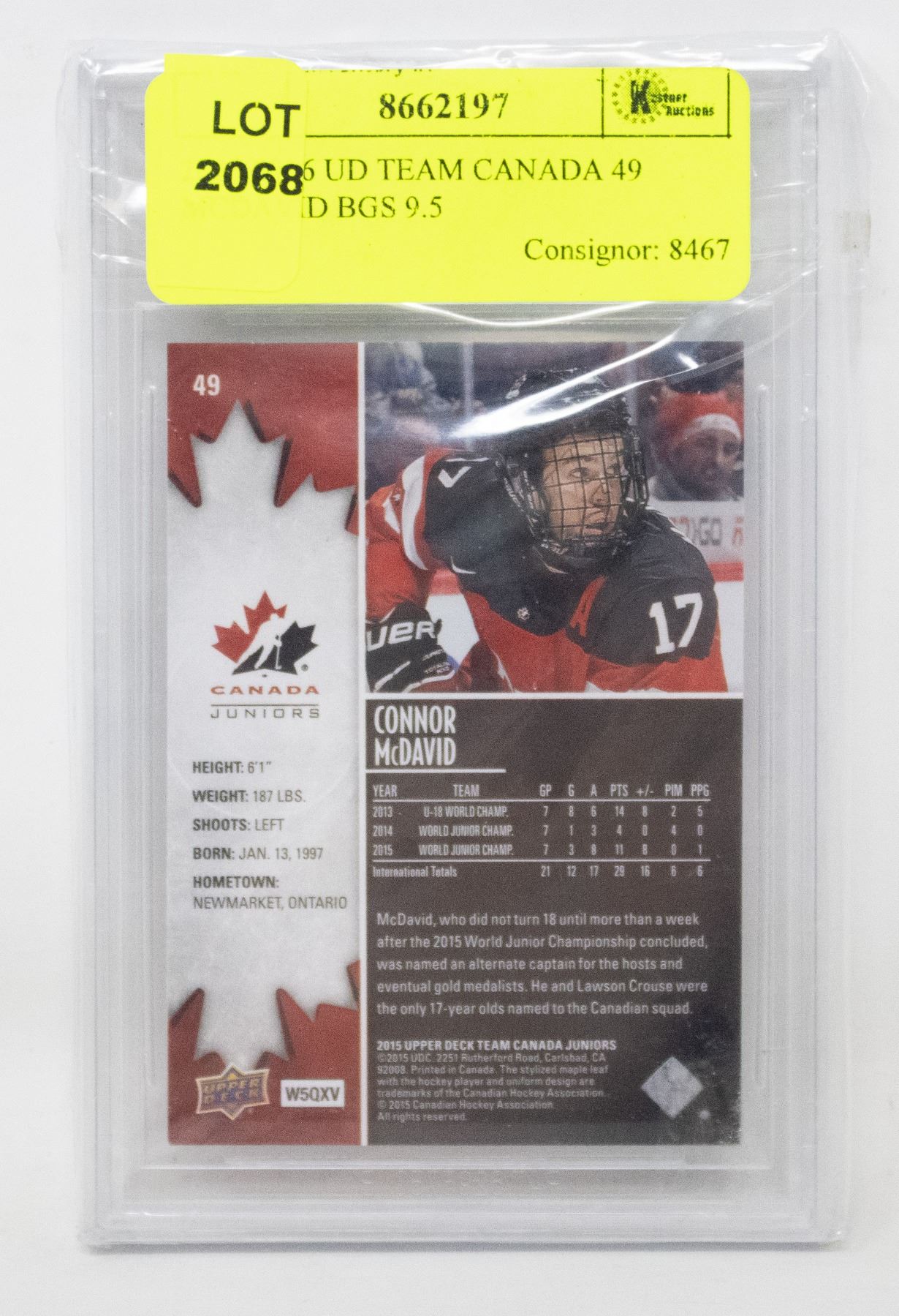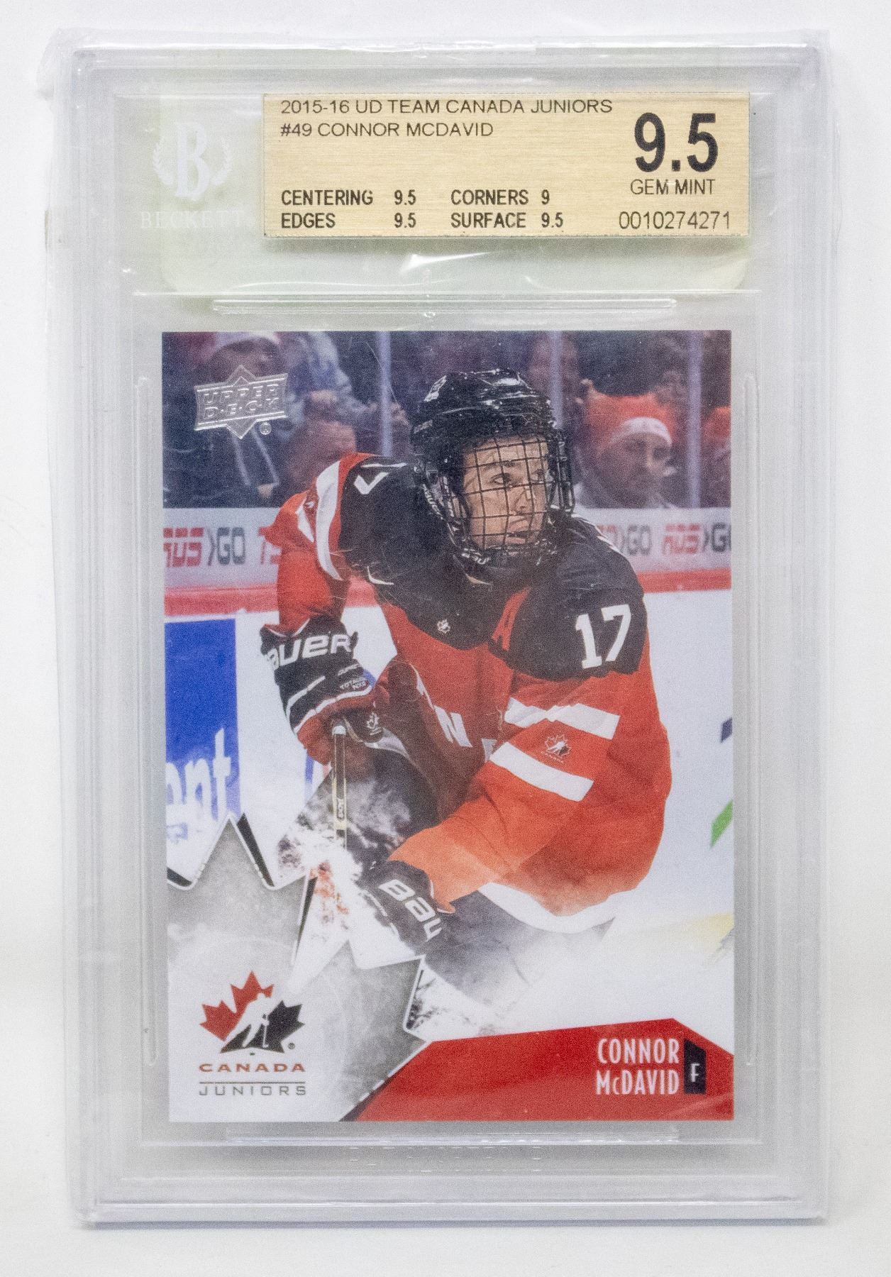 UNSUNG HERO FOR ROOKIE YEAR CARDS, THIS CANADA JUNIORS CARD HIGHLIGHTS CONNOR MCDAVID, THE GOLD MEDALIST, AS BEING ONE OF ONLY TWO 17 YEAR OLDS ON THIS TEAM. BGS ONLY HAS 7 9.5 GRADED CARDS, WITH NO TENS EVER GIVEN OUT.