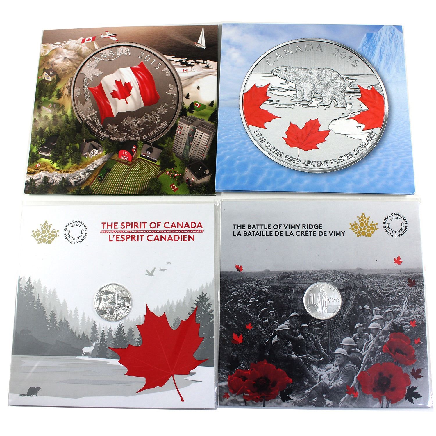 2015-2017 Assorted Fine Silver Collectable Coins. INCLUDES: 2015 $25 Canadian Flag ($25 for $25), 2016 $25 True North ($25 for $25), 2017 $3 100th Anniversary of the Battle of Vimy Ridge, & 2017 $3 The Spirit of Canada. Some light toning; creased card of Vimy Ridge coin. 4pcs. (Tax Exempt)