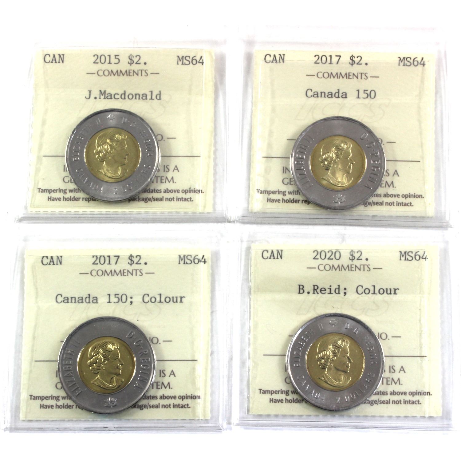 2015-2020 Canada $2 ICCS Certified MS-64 - 2015 J. Macdonald, 2017 Canada 150, 2017 Canada 150 Colour & 2020 Bill Reid Colour. 4pcs