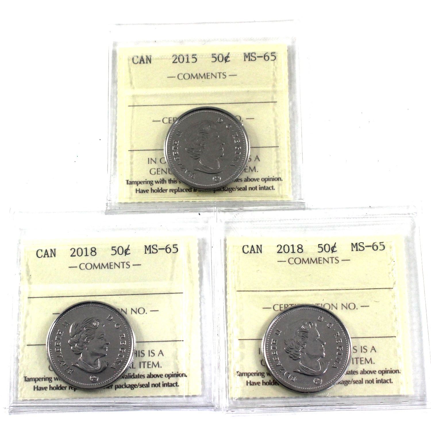 2015 & 2x 2018 Canada 50-cent ICCS Certified MS-65. 3pcs