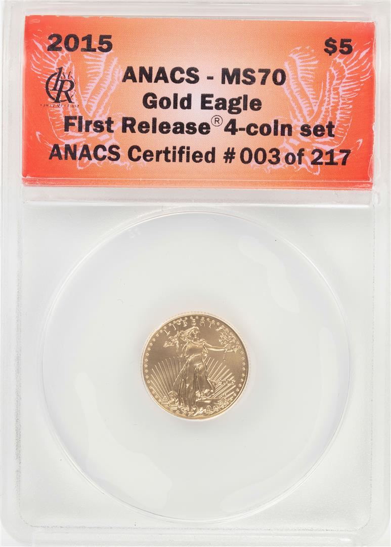 One 2015 $5 American Gold Eagle Coin ANACS MS70 First Release. ANACS Certified.
