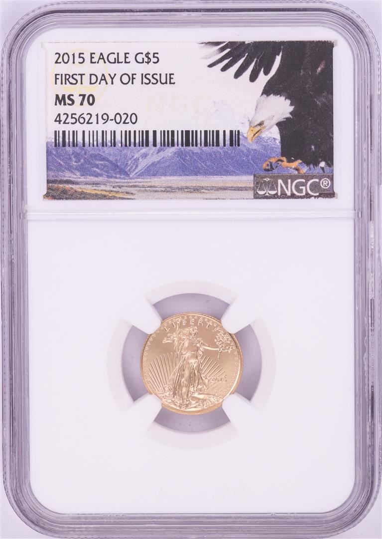 One 2015 $5 American Gold Eagle Coin NGC MS70 First Day of Issue. NGC Certified.