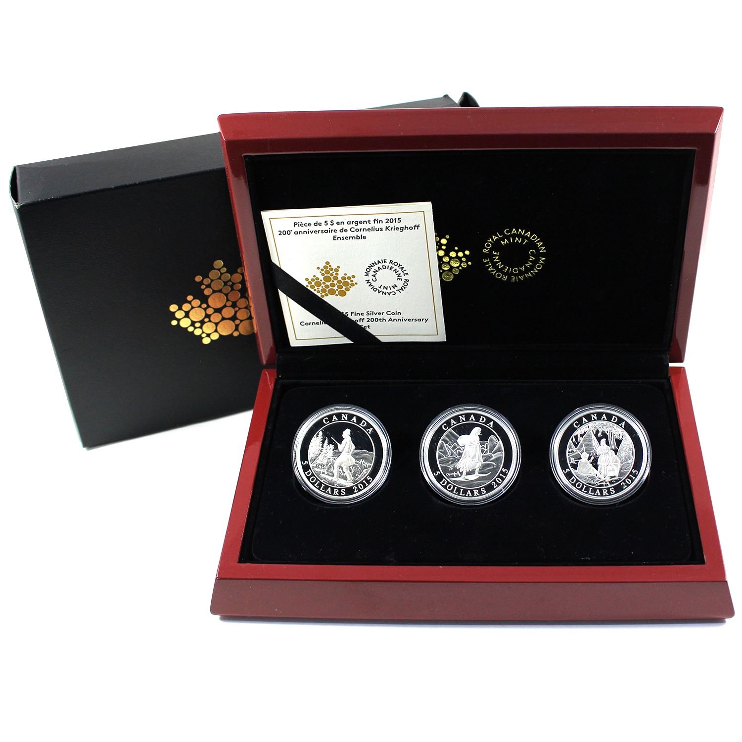 2015 $5, Cornelius Krieghoff 200th Anniversary 3-piece Fine Silver Set. Worn sleeve; scratched capsules (Tax Exempt)