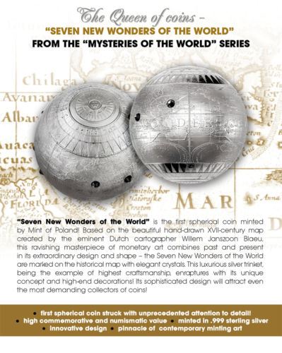 "Seven New Wonders of the World" is the first spherical coin minted by Mint of Poland! Based on the beautiful hand-drawn XVII-century map created by the eminent Dutch cartographer Willem Janszoon Blaeu, this ravishing masterpiece of monetary art combines past and present in its extraordinary design and shape - the Seven New Wonders of the World are marked on the historical map with elegant crystals. The Mint of Poland has taken the next step towards conquering the third dimension of the coin universe. In order to create the spherical coin "Seven New Wonders of the World", our minters, well known for their exquisite craftsmanship implemented the most innovative solutions into the technological process. Thanks to a specially created 6-element die they succeeded not only in creating the ideally spherical shape of the coin, but also in adorning it with intricate relief images.