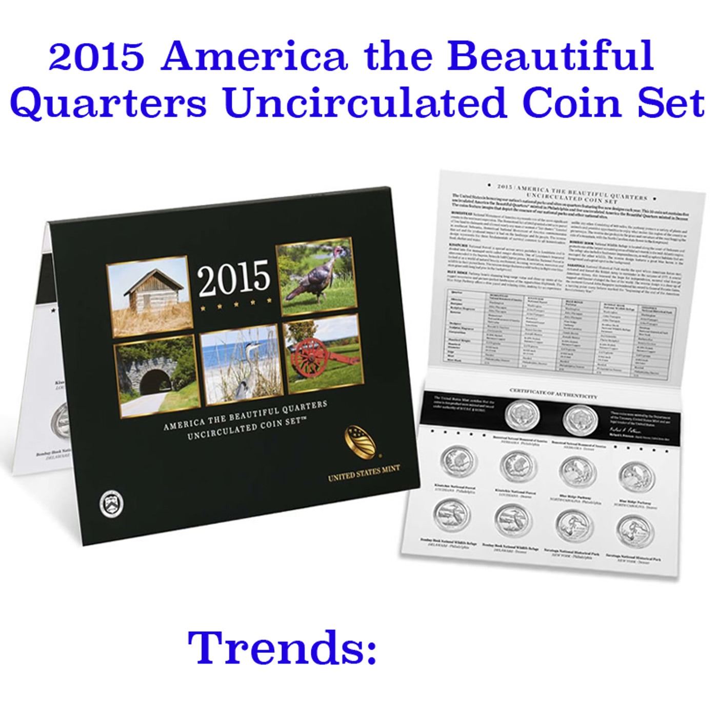 2015 America the Beautiful Quarters Uncirculated Coin Set. This 2015 America the Beautiful Quarters Uncirculated Set gives you all five quarters from the year, including:Homestead National Monument of America in Nebraska,Kisatchie National Forest in Louisiana,Blue Ridge Parkway in North Carolina,Bombay Hook National Wildlife Refuge in Delaware, andSaratoga National Historical Park in New York.Your 2016 America the Beautiful Quarters Uncirculated Set features all five designs as struck by both Philadelphia and Denver mints -- that equals a comprehensive set of ten coins in Brilliant Uncirculated (BU) condition! All of your quarters will be housed in an illustrated holder featuring beautiful photos of each site as well as coin specifications and an official U.S. Mint certificate of authenticity. Collectors of all ages eagerly await these sets to arrive each year, and we're already projecting demand for these 2016 sets to be high.