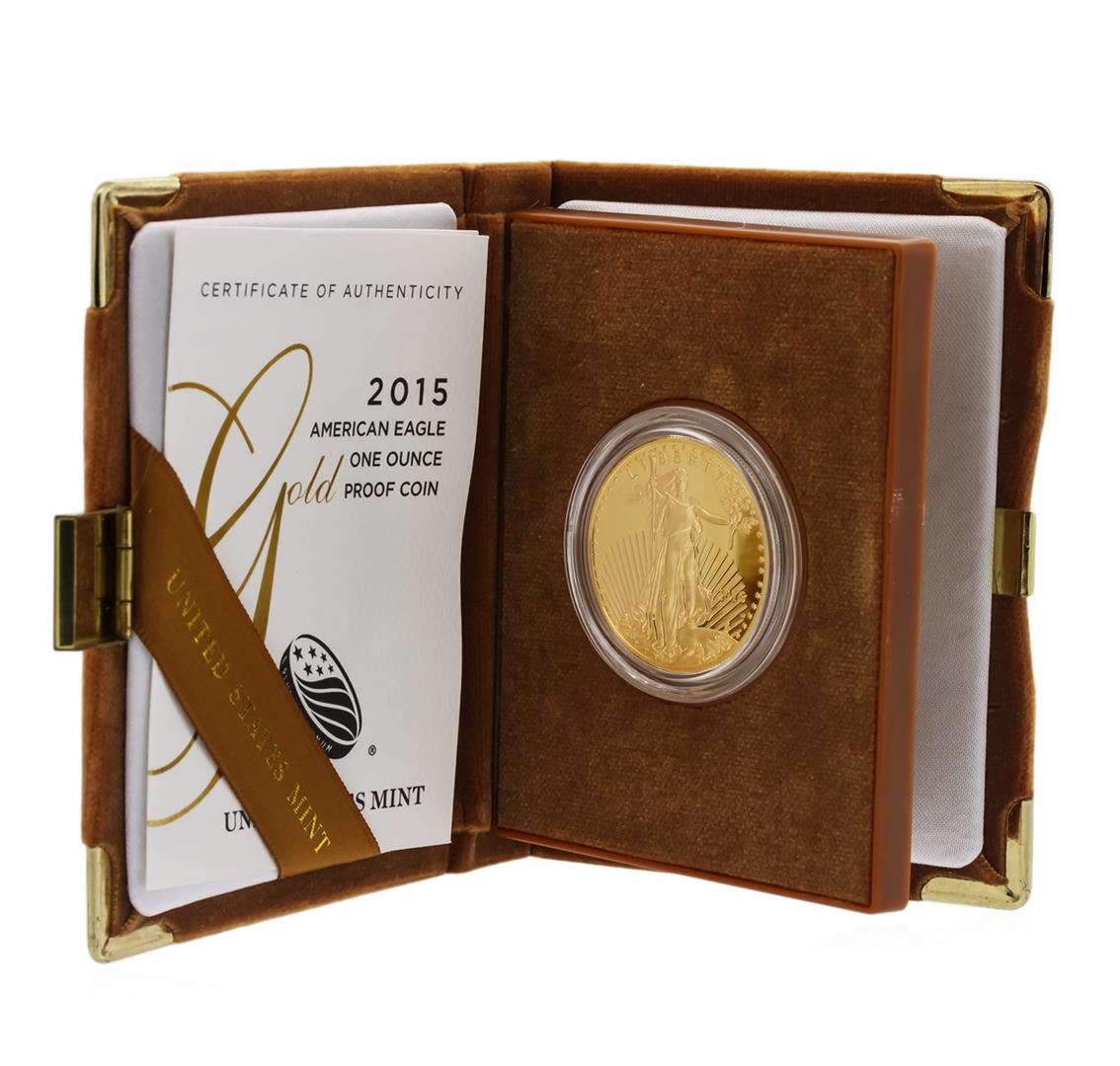 One 2015 American Eagle 1 Ounce Gold Proof Coin. Denomination: $50. Finish: Proof. Composition: 91.67% Gold 3.0% Silver Balance Copper. Content: Gold 1.0000 troy oz. (31.1035 grams). Diameter: 1.287 inches (32.70 mm). Weight: 1.0909 troy oz. (33.931 grams). Thickness: 0.113 inch (2.87 mm). Edge: Reeded. Mint: West Point. Mint Mark: W.