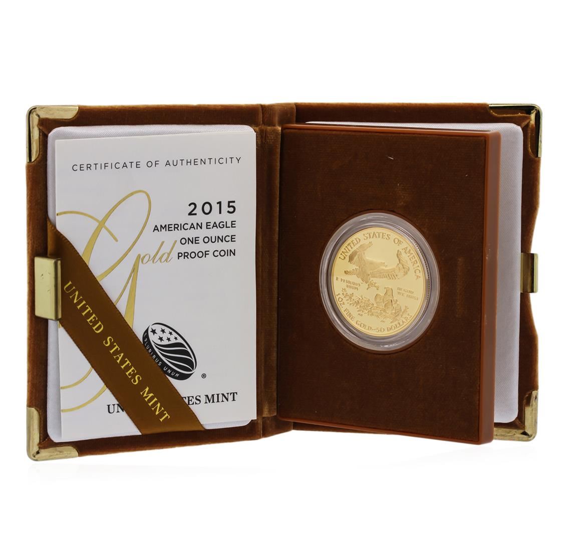 One 2015 American Eagle 1 Ounce Gold Proof Coin. Denomination: $50. Finish: Proof. Composition: 91.67% Gold 3.0% Silver Balance Copper. Content: Gold 1.0000 troy oz. (31.1035 grams). Diameter: 1.287 inches (32.70 mm). Weight: 1.0909 troy oz. (33.931 grams). Thickness: 0.113 inch (2.87 mm). Edge: Reeded. Mint: West Point. Mint Mark: W.