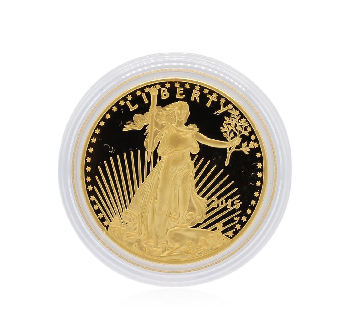 One 2015 American Eagle 1 Ounce Gold Proof Coin. Denomination: $50. Finish: Proof. Composition: 91.67% Gold 3.0% Silver Balance Copper. Content: Gold 1.0000 troy oz. (31.1035 grams). Diameter: 1.287 inches (32.70 mm). Weight: 1.0909 troy oz. (33.931 grams). Thickness: 0.113 inch (2.87 mm). Edge: Reeded. Mint: West Point. Mint Mark: W.