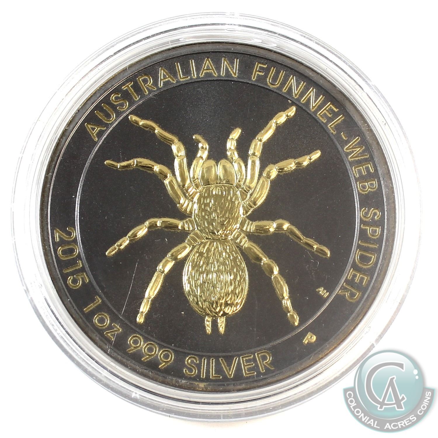 2015 Australia 1oz Funnel-Web Spider Gold & Ruthenium Plated .999 Fine Silver Coin in Capsule. (Scratched capsule). (TAX Exempt)