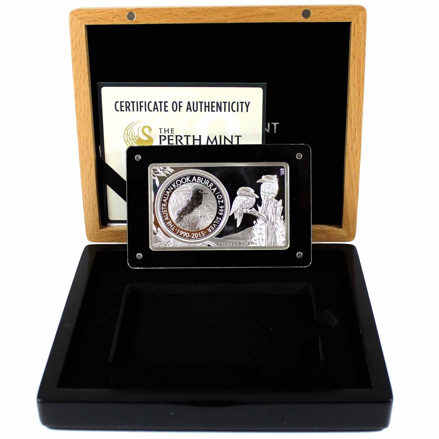 2015 Australia 25th Anniversary of the Silver Kookaburra 3oz Bar/Coin (Tax Exempt). This item contains a 2015 1oz Kookaburra surrounded by a 2oz Fine Silver Bar. Comes in an acrylic holder for display with clamshell case and COA.