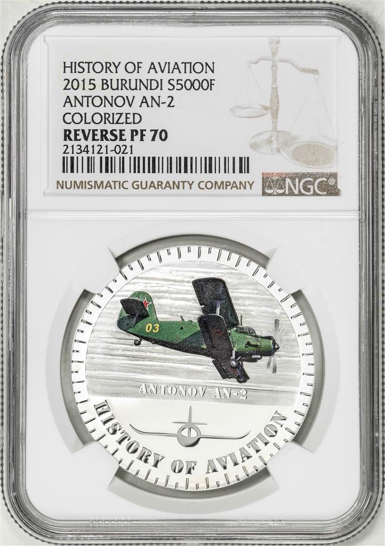 One 2015 Burundi 5000 Francs Aviation History Antonov AN-2 Silver Coin NGC Reverse PF70. NGC Certified.