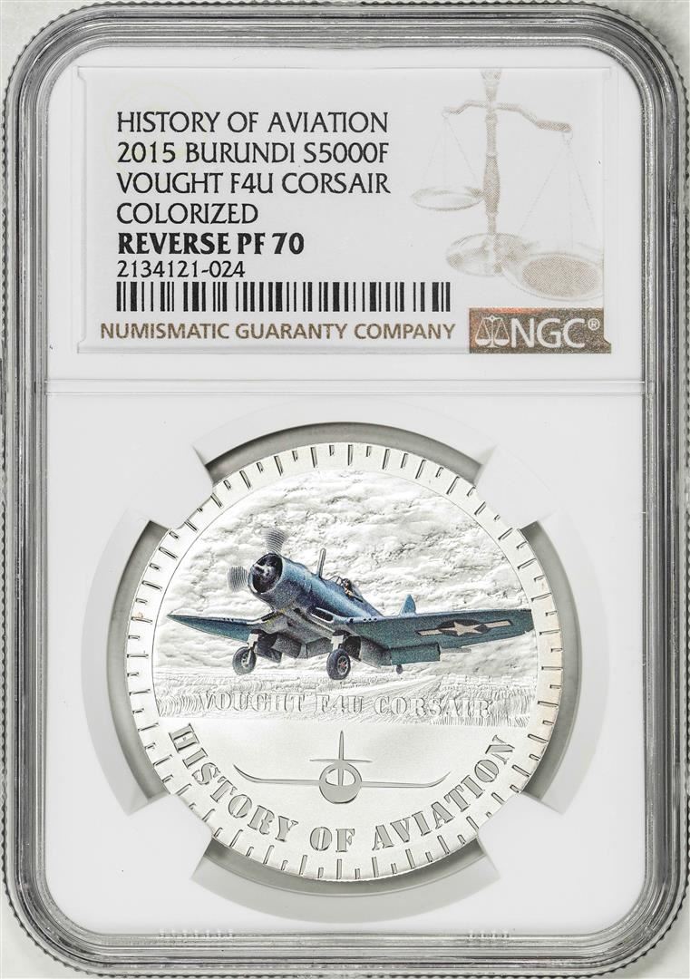 One 2015 Burundi 5000 Francs Aviation History Vought F4U Corsair Silver Coin NGC Rev PF70. NGC Certified.
