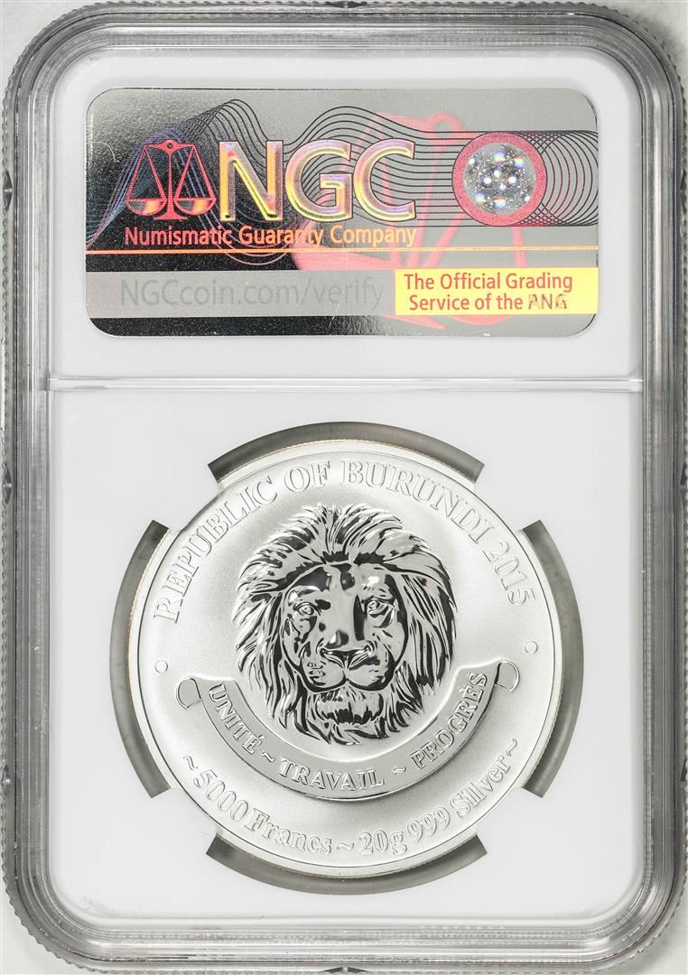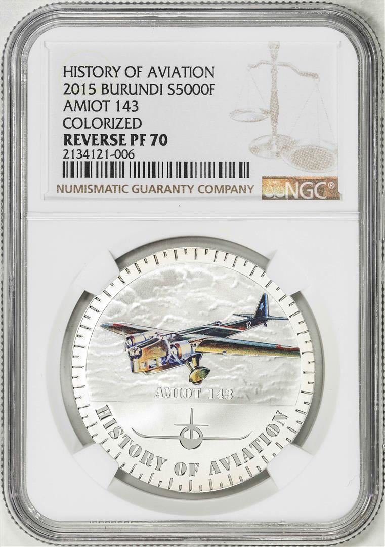 One 2015 Burundi 5000 Francs History of Aviation Amiot 143 Silver Coin NGC Reverse PF70. NGC Certified.