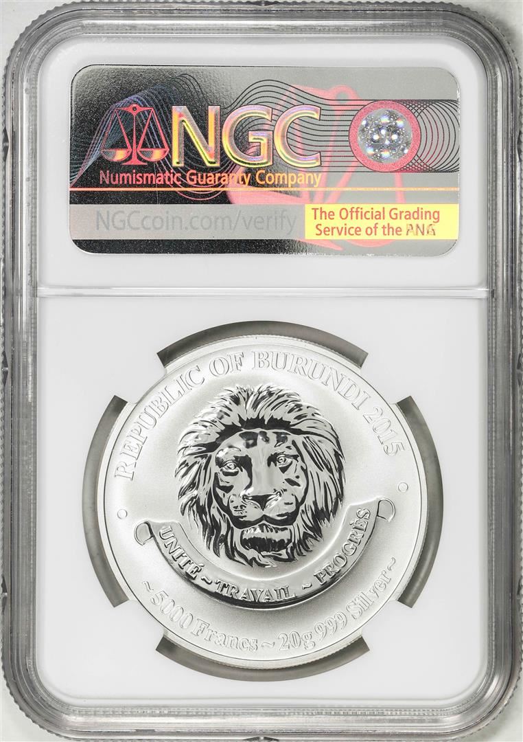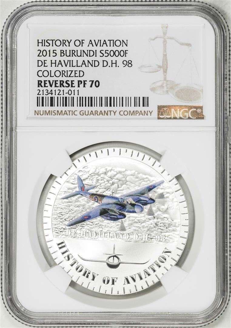 One 2015 Burundi 5000 Francs History of Aviation De Havilland 98 Silver Coin NGC Rev PF70. NGC Certified.