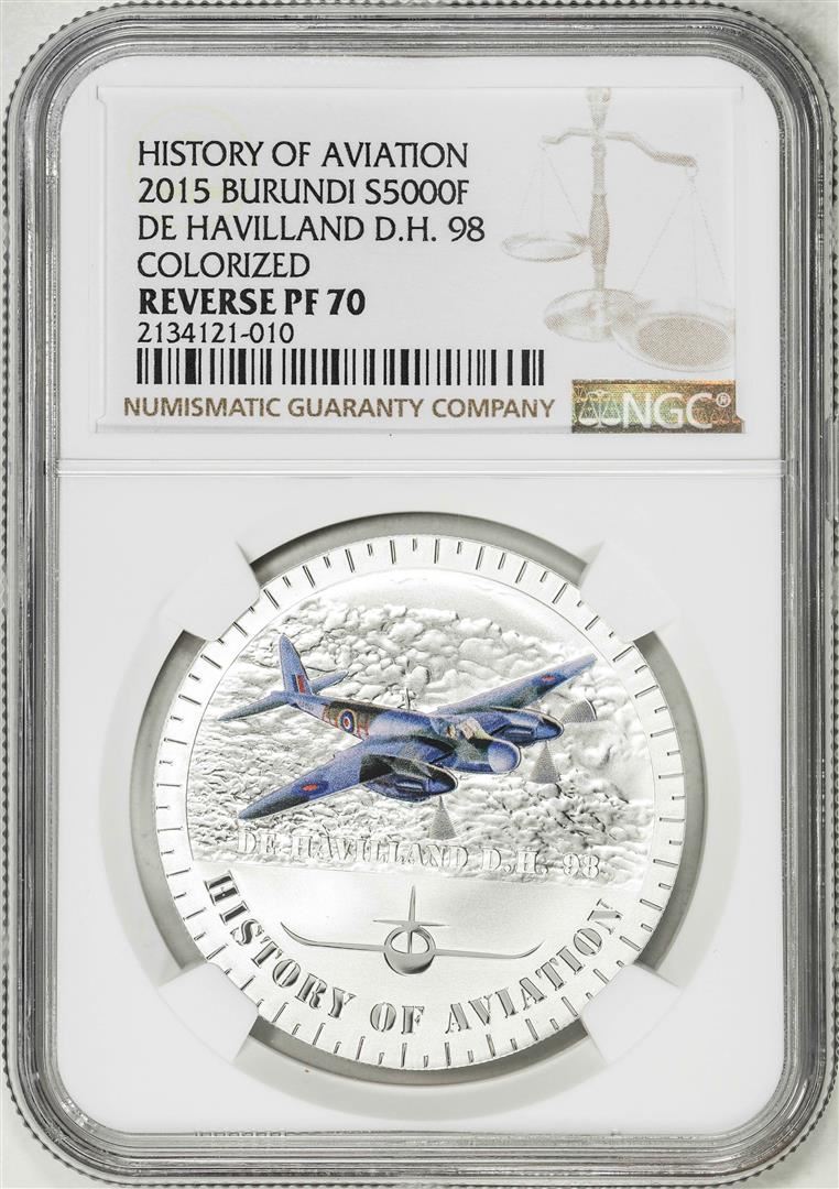 One 2015 Burundi 5000 Francs History of Aviation De Havilland 98 Silver Coin NGC Rev PF70. NGC Certified.