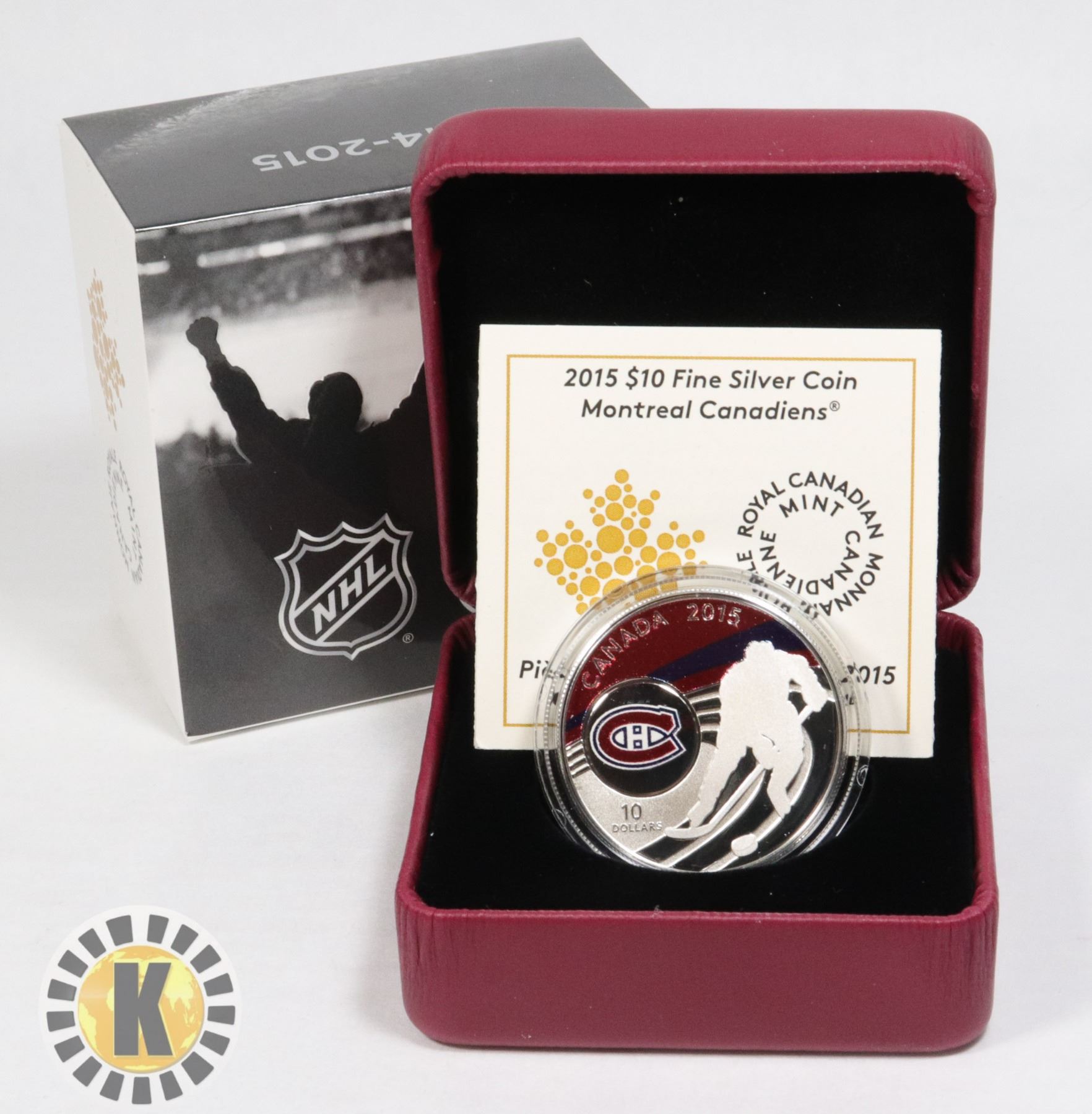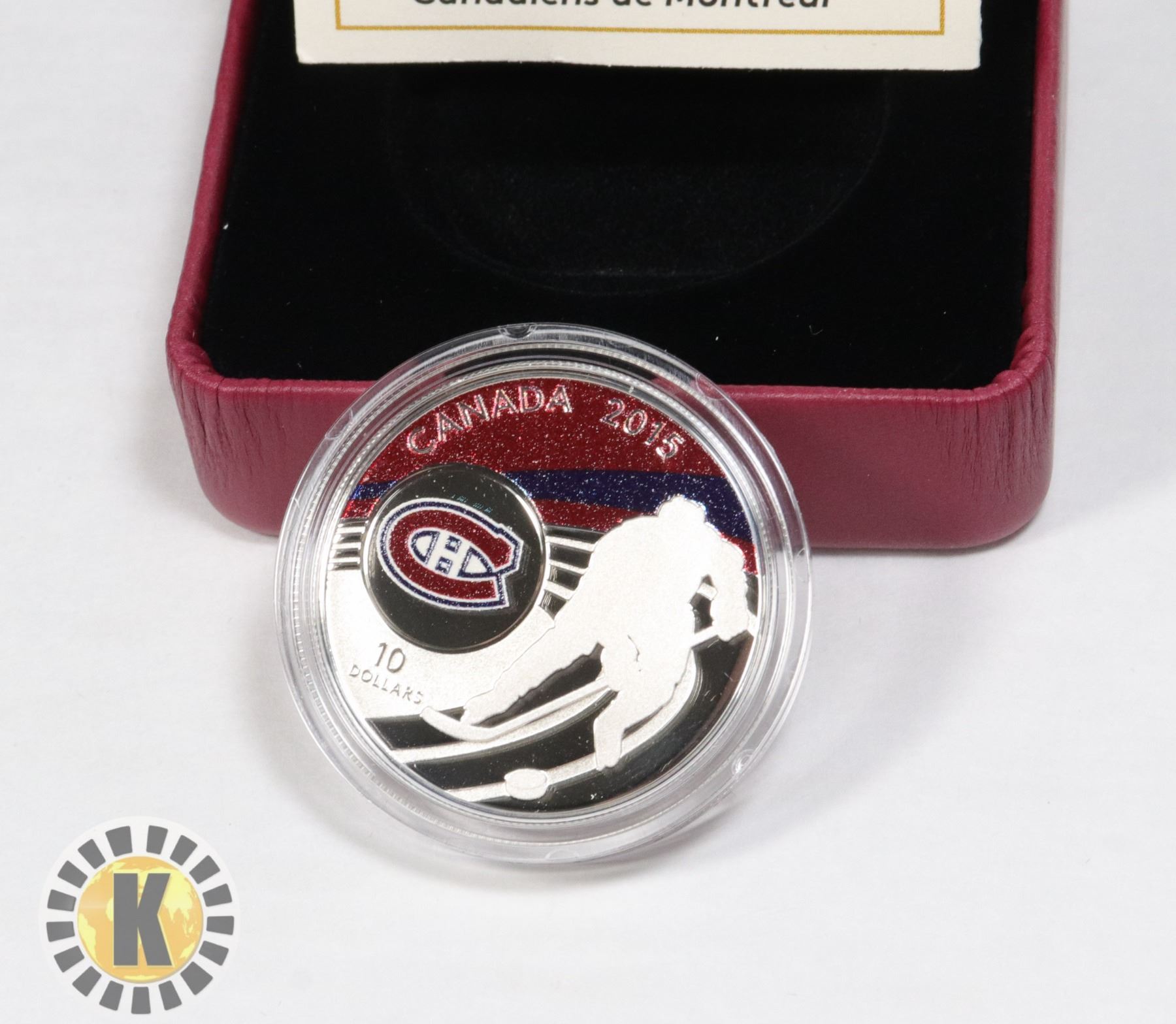 CANADIENS COLORED COIN. (60,000 ONLY MINTED). FINISH: REVERSE PROOF. SERIALIZED , COMES WITH CERTIFICATE OF AUTHENTICITY, MAROON CLAMSHELL WITH DECORATIVE BOX. 1 COIN IN SERIES OF 7***ITEM(S) LOCATED IN LETHBRIDGE ALBERTA, SMALL ITEMS ONLY ARE AVAILABLE FOR FREE TRANSPORT TO EDMONTON OFFICE (READ AUCTION DETAILS FOR MORE INFORMATION)