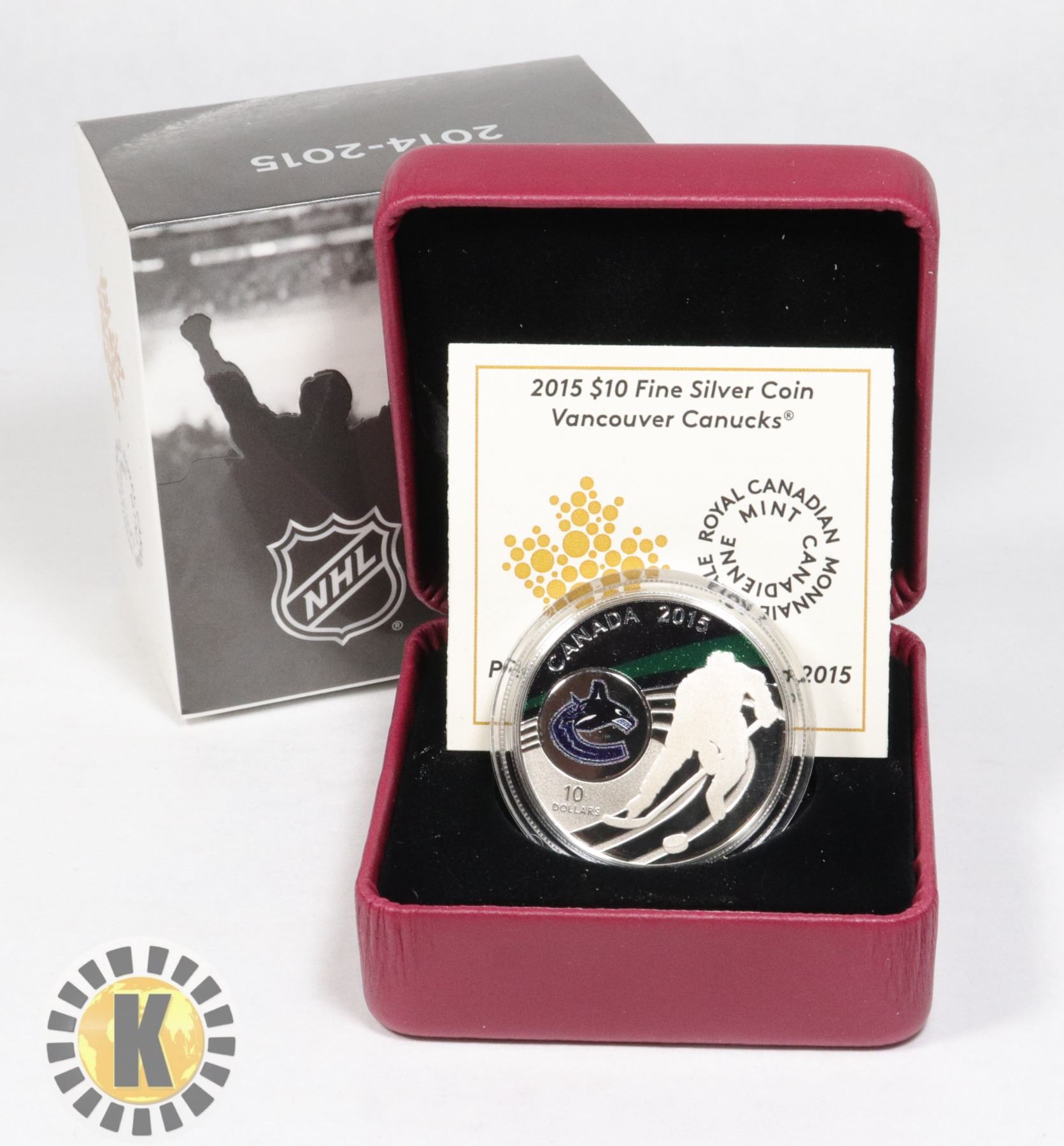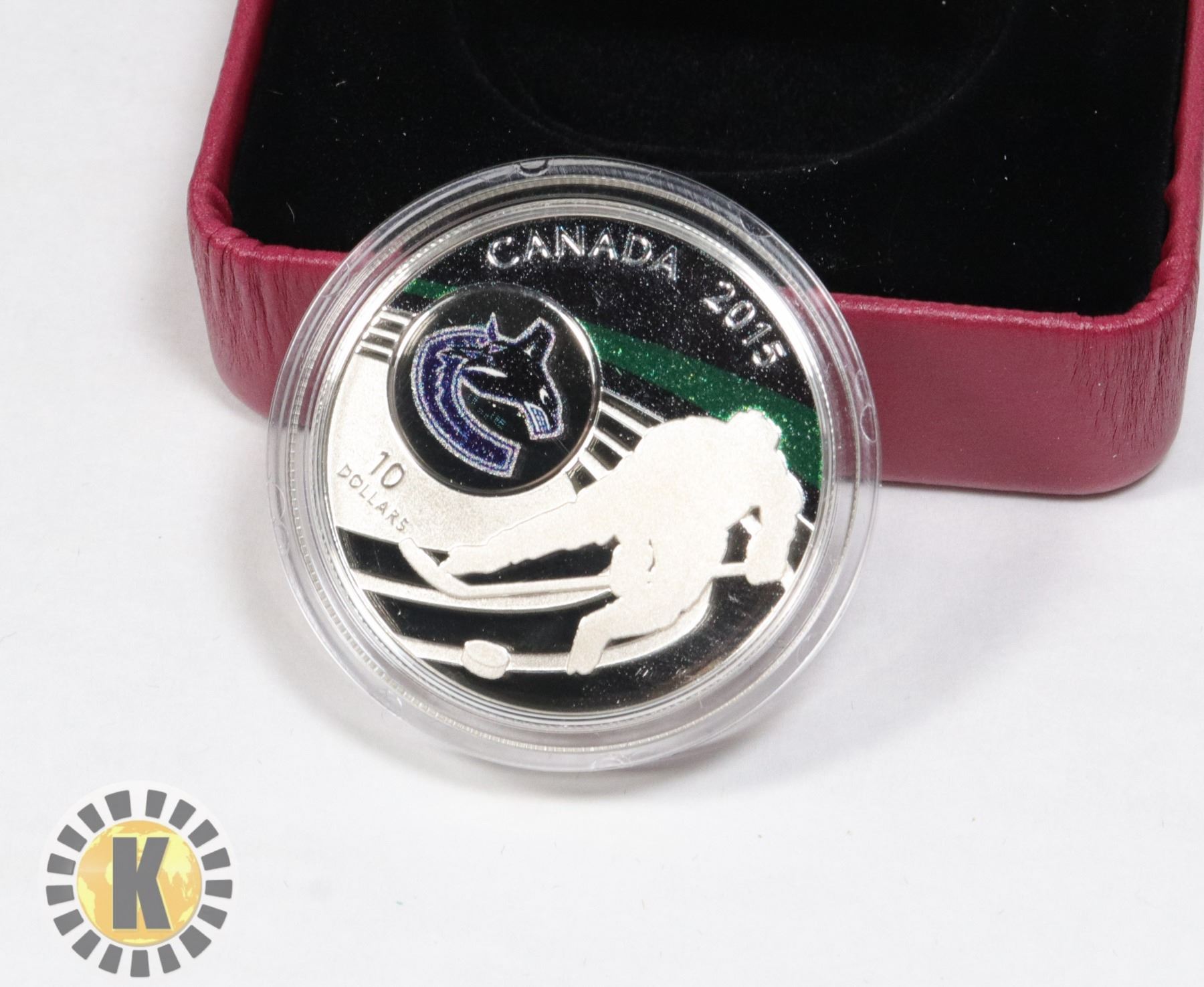 CANUCKS COLORED COIN. (60,000 ONLY MINTED). FINISH: REVERSE PROOF. SERIALIZED , COMES WITH CERTIFICATE OF AUTHENTICITY, MAROON CLAMSHELL WITH DECORATIVE BOX. 1 COIN IN SERIES OF 7***ITEM(S) LOCATED IN LETHBRIDGE ALBERTA, SMALL ITEMS ONLY ARE AVAILABLE FOR FREE TRANSPORT TO EDMONTON OFFICE (READ AUCTION DETAILS FOR MORE INFORMATION)