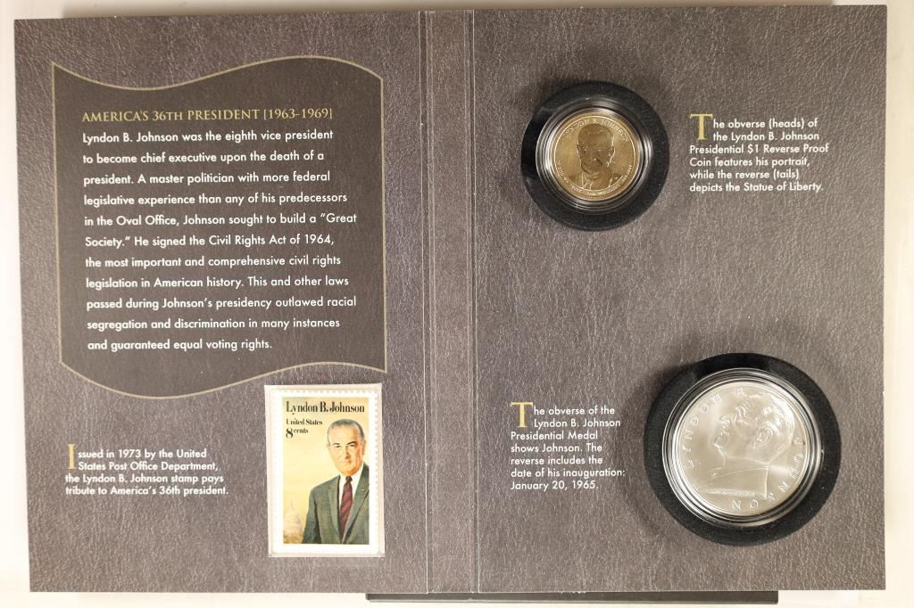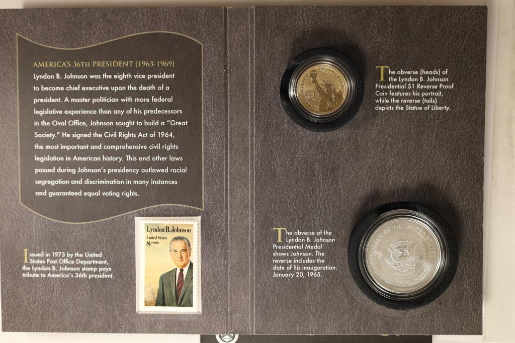 FEATURING A 1973 - 8 CENT STAMP, $1 REVERSE PROOF PRESIDENTIAL COIN AND A .999 FINE SILVER PRESIDENTIAL MEDAL, ORIGINAL US MINT PACKAGING