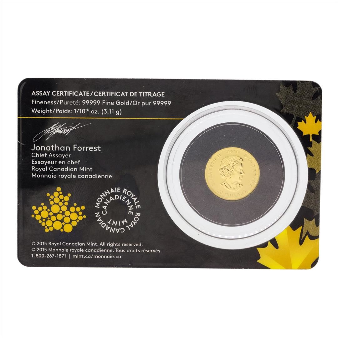One 2015 Canada 1/10 oz Gold Howling Wolf .99999 BU Coin.