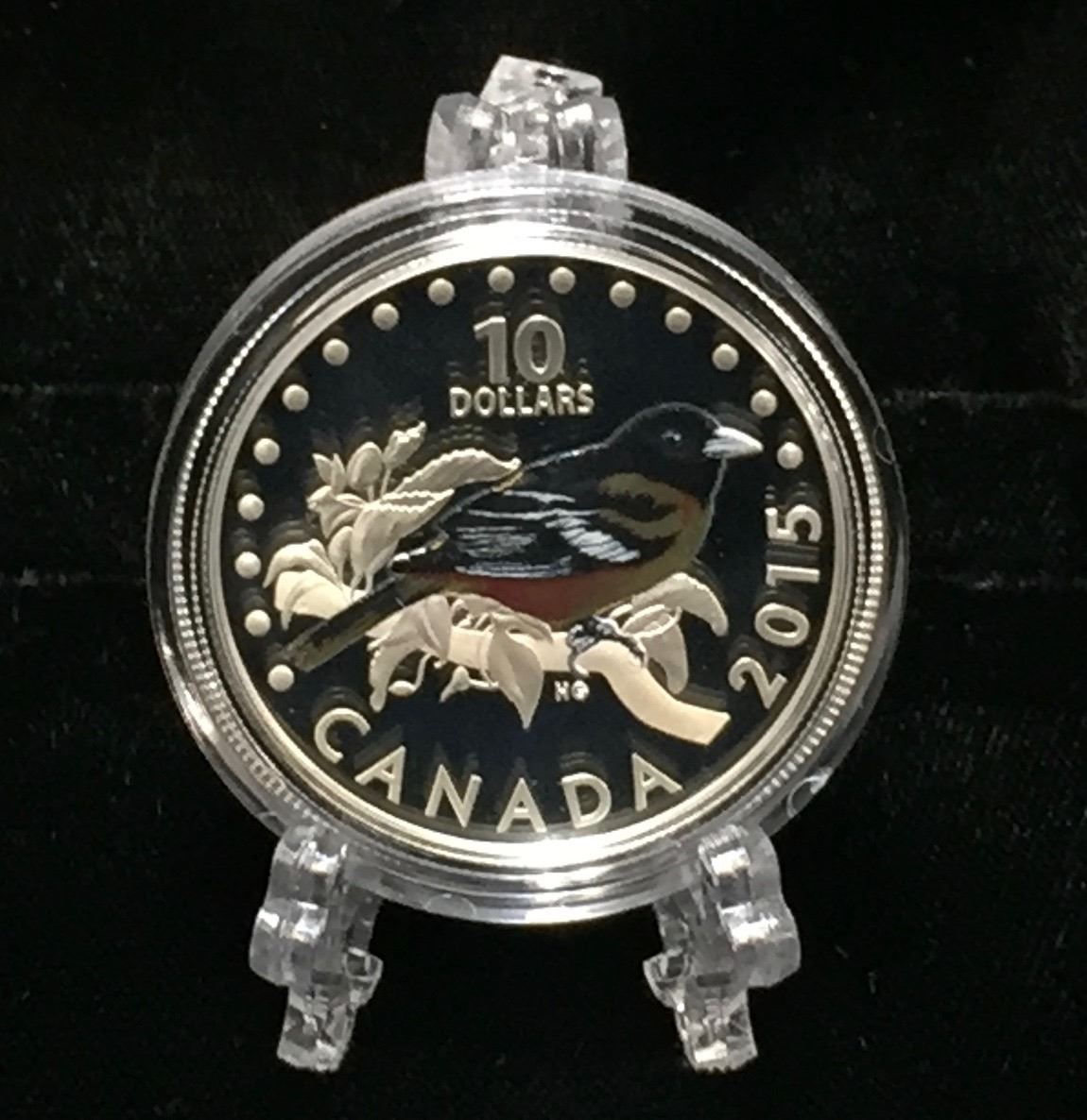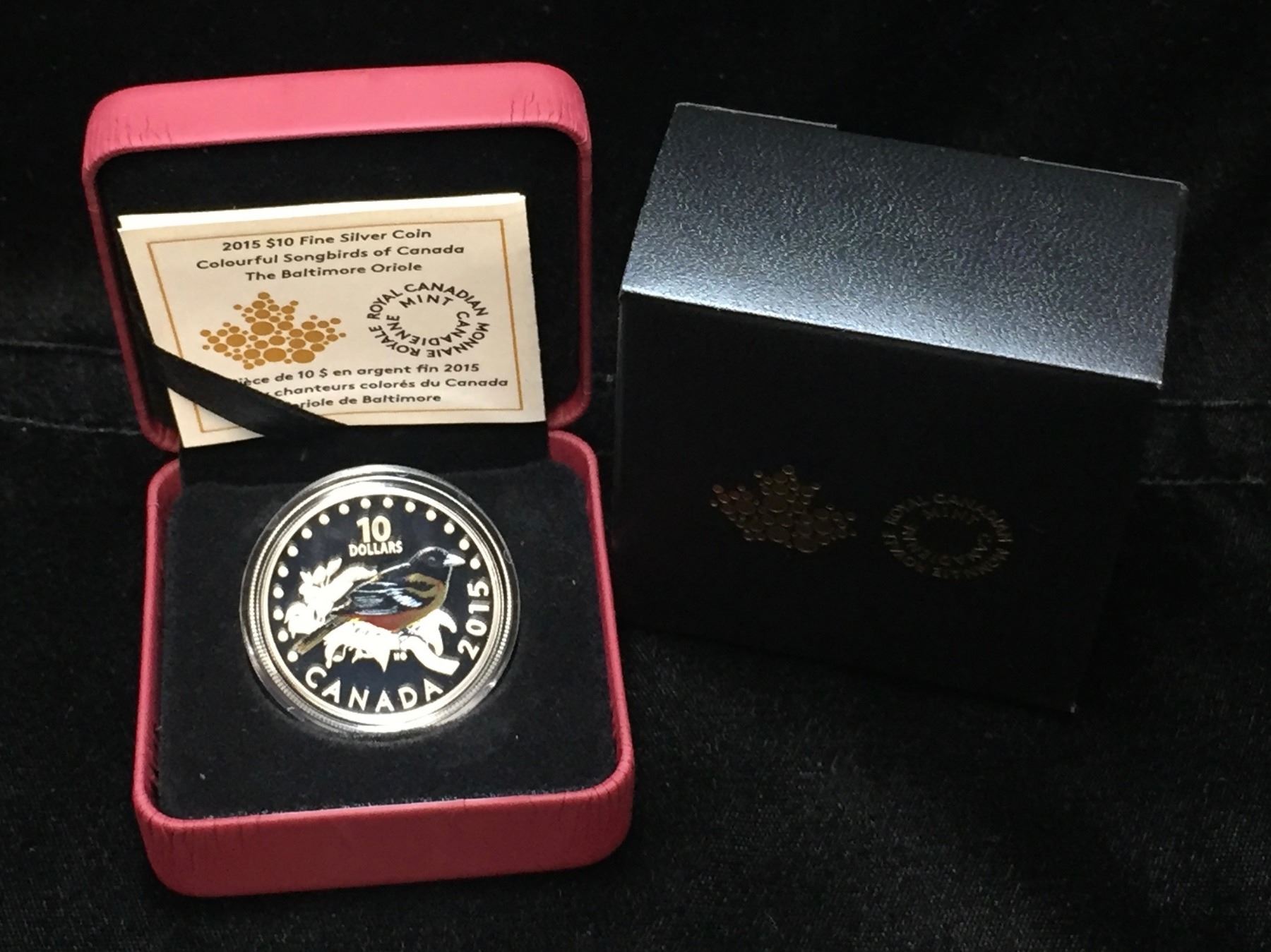 Lot 49; Royal Canadian Mint, 2015 Canada $10 Baltimore Oriole: Colourful Songbirds of Canada Proof Silver Coin, Coloured, Proof Finish, Queen Elizabeth II Effigy, RCM Packing