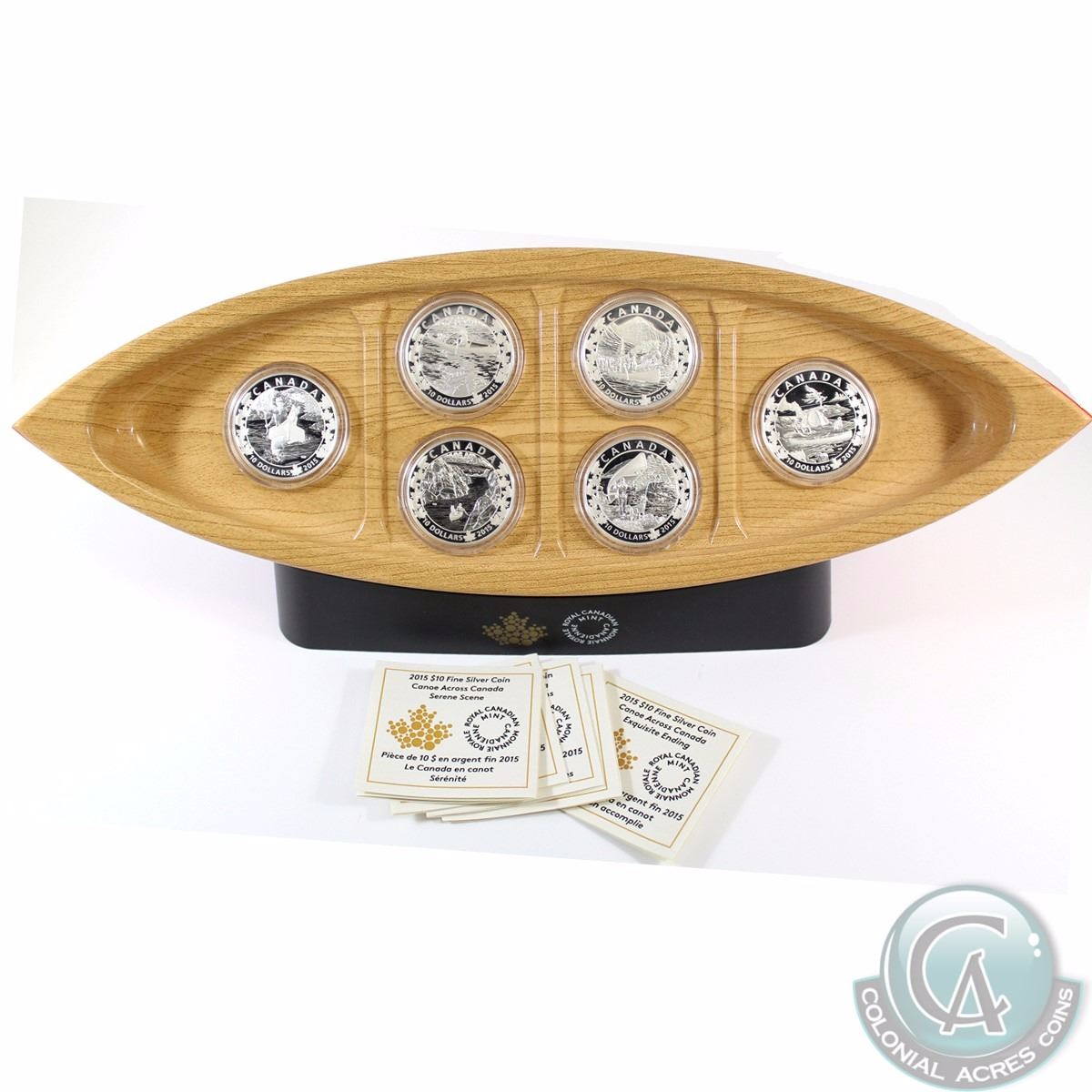 2015 Canada $10 Canoe Across Canada 6-Coin Set with Deluxe (Canoe Shaped) Wooden Box (TAX Exempt). You will receive #1 Wondrous West, #2 Splendid Surroundings, #3 Magnificent Mountains, #4 Serene Scene, #5 Mirror, Mirror, and #6 Exquisite Ending. Each coin comes encapsulated with COA's.