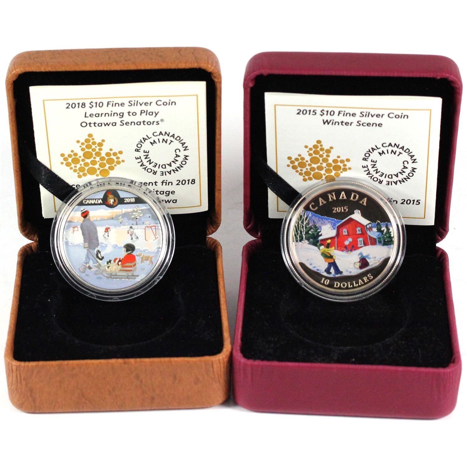 2015 Canada $10 Winter Scene & 2018 $10 Learning To Play - Ottawa Senators Fine Silver Coins Encapsulated in RCM Display Boxes with COAs (2015 capsule lightly scratched & 2015 coin toned). 2pcs (TAX Exempt)