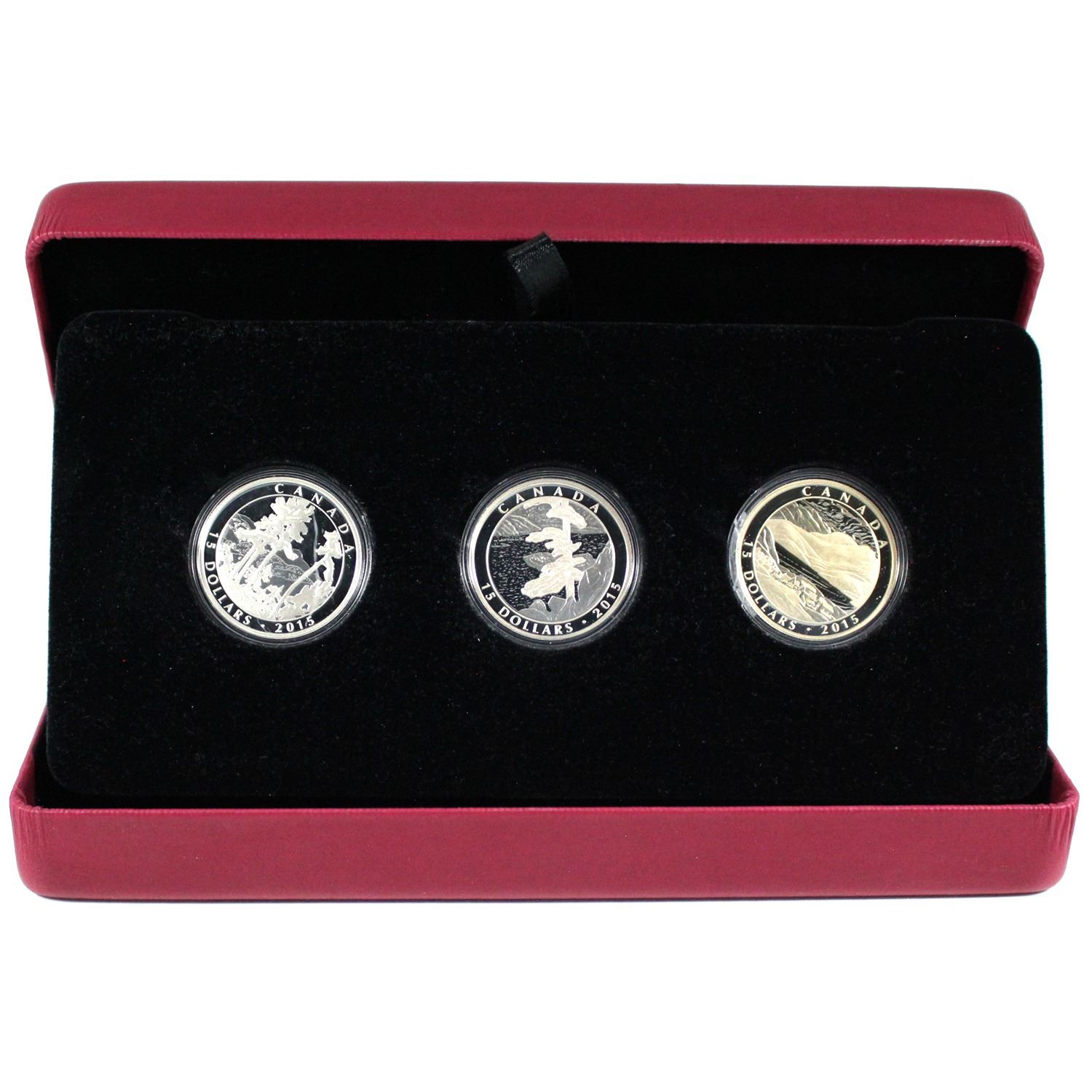 2015 Canada $15 Franklin Carmichael Fine Silver 3-coin Set (coins are toned and capsule is cracked). Tax Exempt