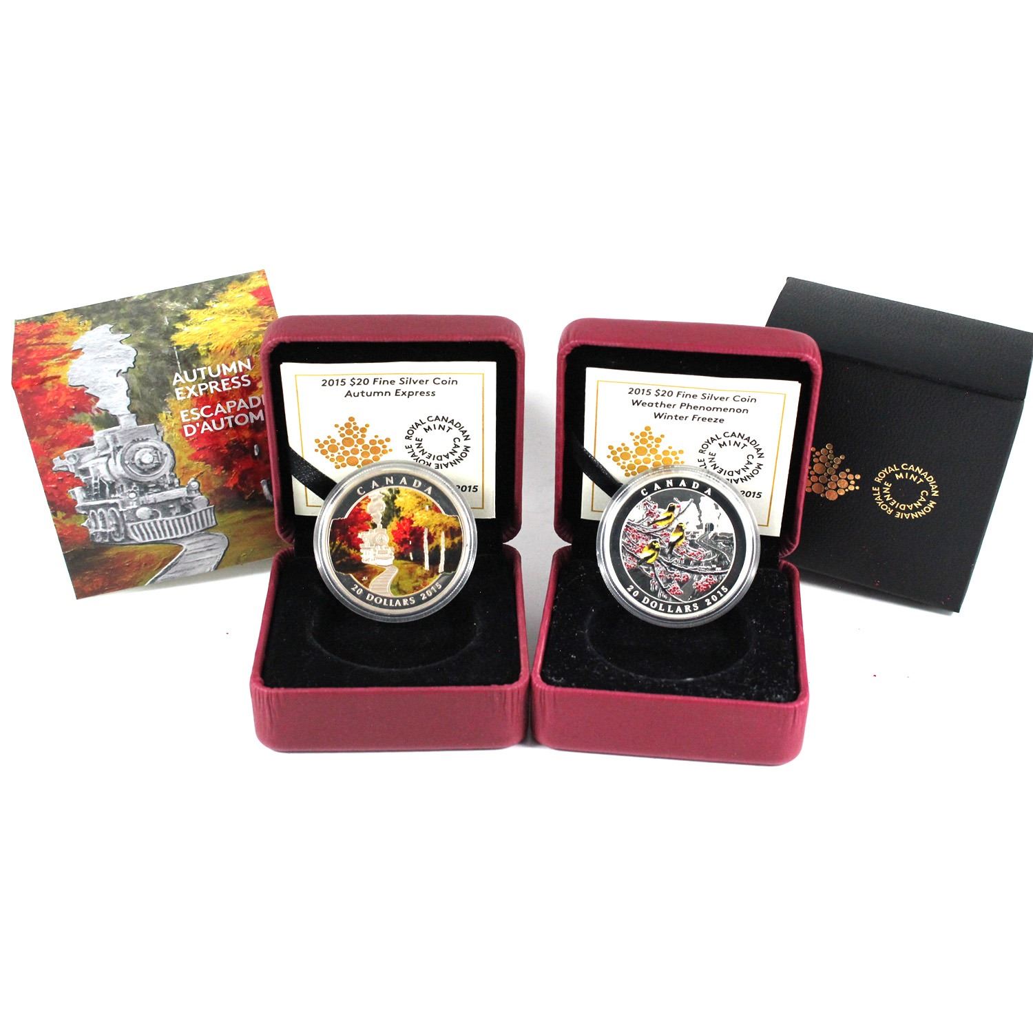 2015 Canada $20 Autumn Express & 2015 $20 Weather Phenomenon - Winter Freeze Fine Silver Coins (Capsules are scratched & coins are lightly toned). 2pcs (TAX Exempt)