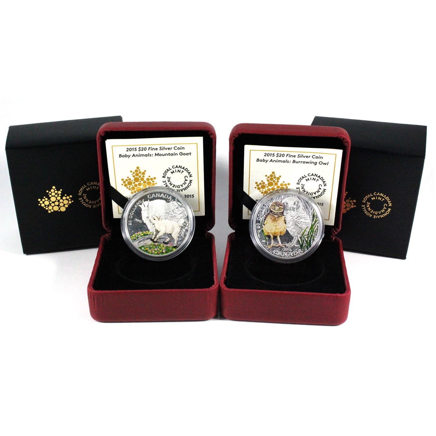 2015 Canada $20 Baby Animals Fine Silver Coins - Burrowing Owl & Mountain Goat. 2pcs (TAX Exempt)