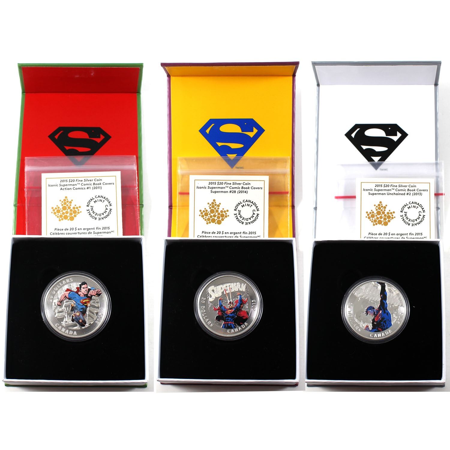 2015 Canada $20 Iconic Superman: Action Comics #1 (2011), Superman Unchained #2 (2013) & Superman #28 (2014) Fine Silver Coins (2014 capsule has residue and outer box is lightly scuffed). 3pcs (TAX Exempt)
