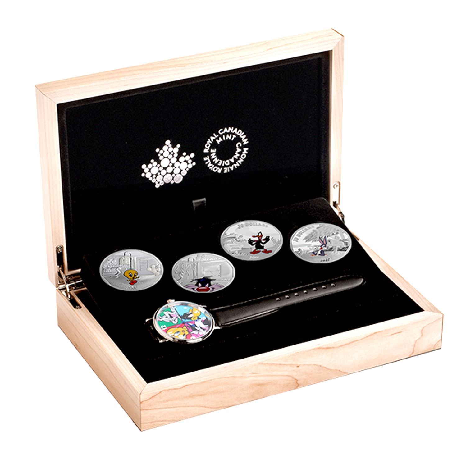 2015 Canada $20 Looney Tunes Classic Scenes 4-coin Fine Silver Coin Set with Commemorative Wristwatch. (TAX Exempt)