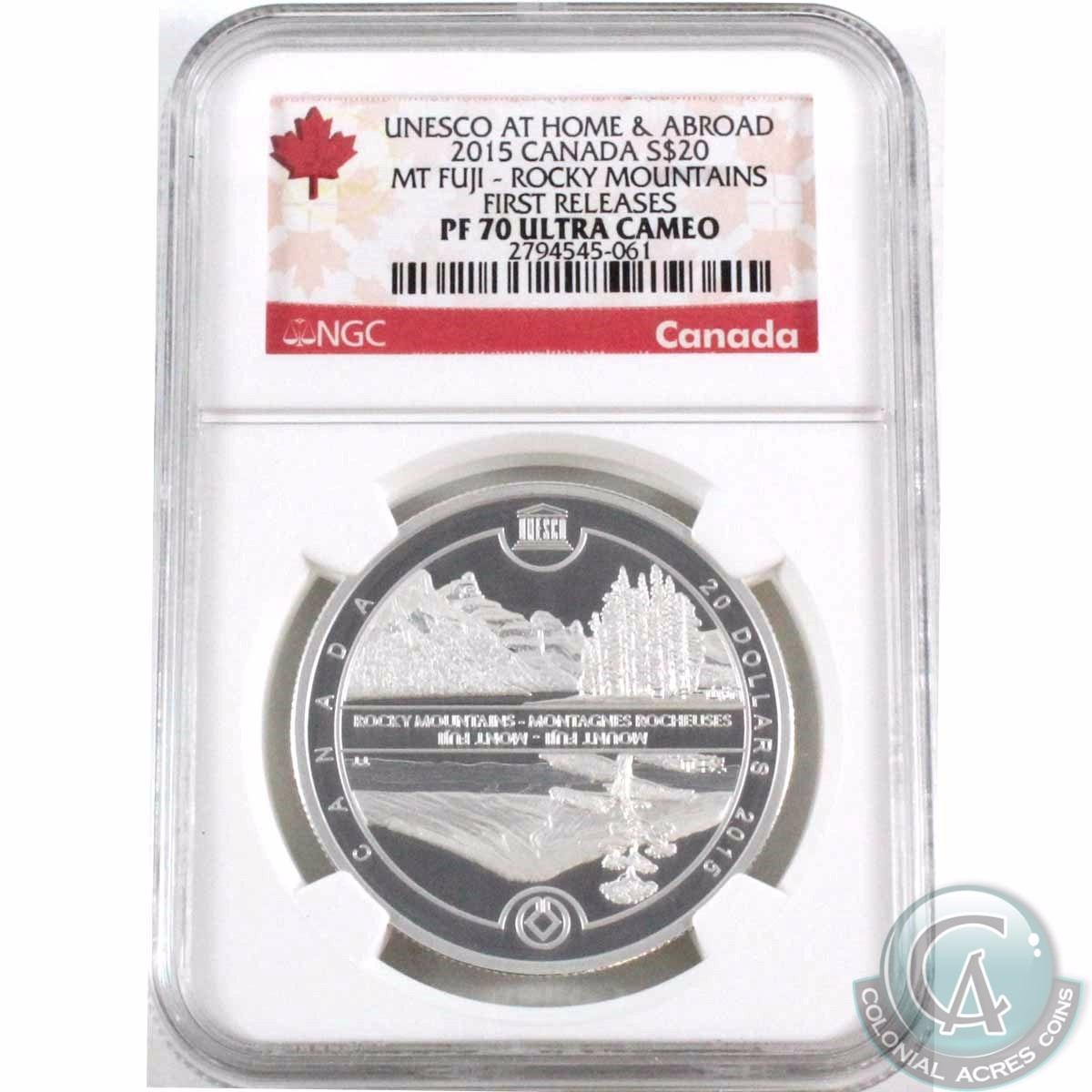 2015 Canada $20 UNESCO at Home & Abroad: Mount Fuji & The Canadian Rockies Fine Silver Coin NGC Certified PF-70; Ultra Cameo (TAX Exempt)
