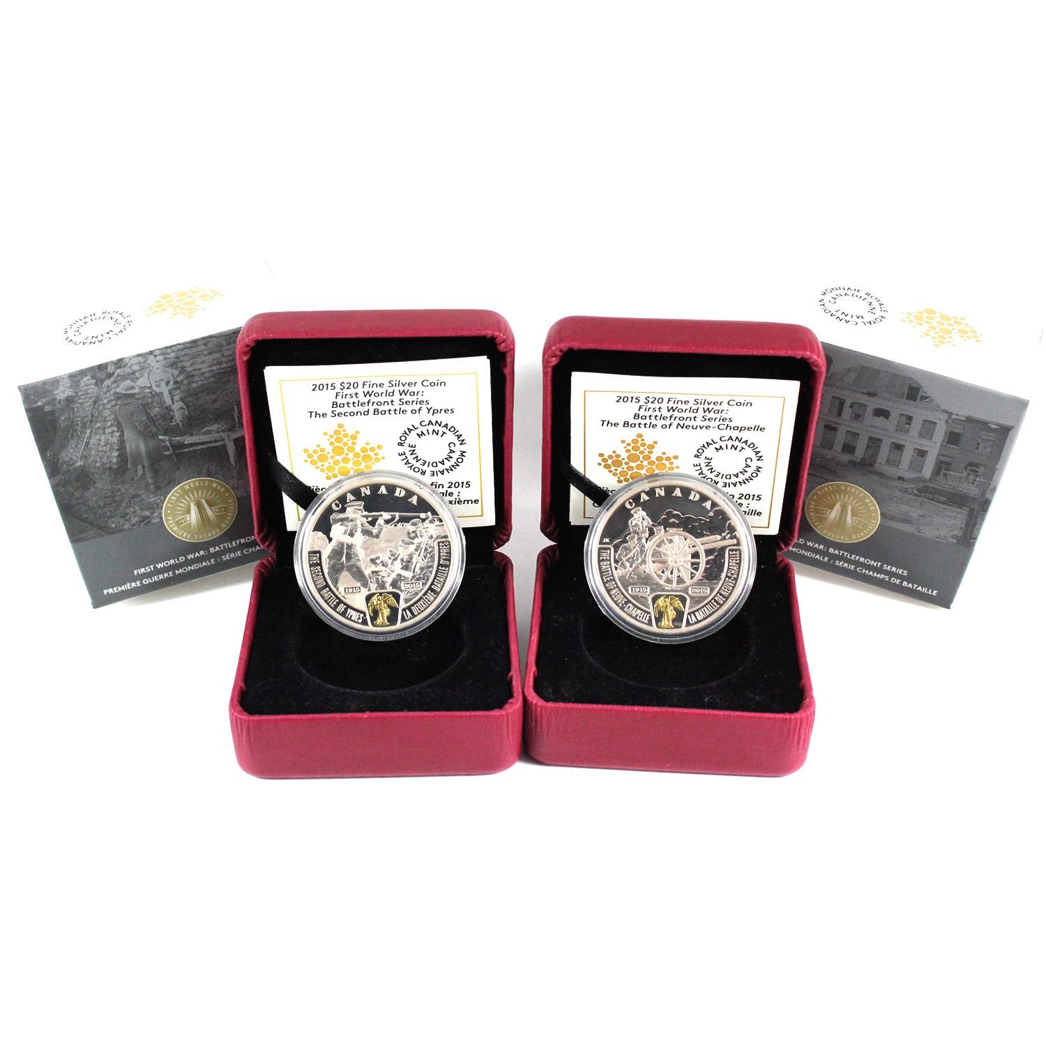 2015 Canada $20 WWI Battlefront - The Second Battle of Ypres & Battle of Neuve-Chapelle Fine Silver Coins (Ypres capsule lightly scratched & coins are toned). 2pcs (TAX Exempt)