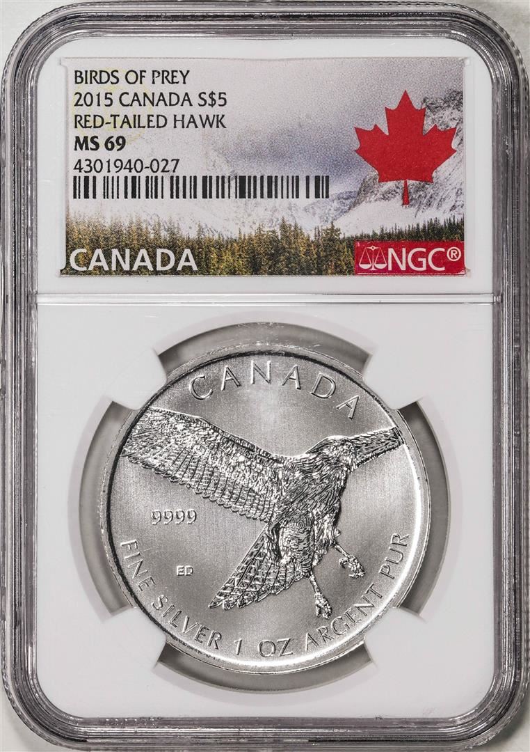 One 2015 Canada $5 Red-Tailed Hawk Birds of Prey Silver Coin NGC MS69. NGC Certified.