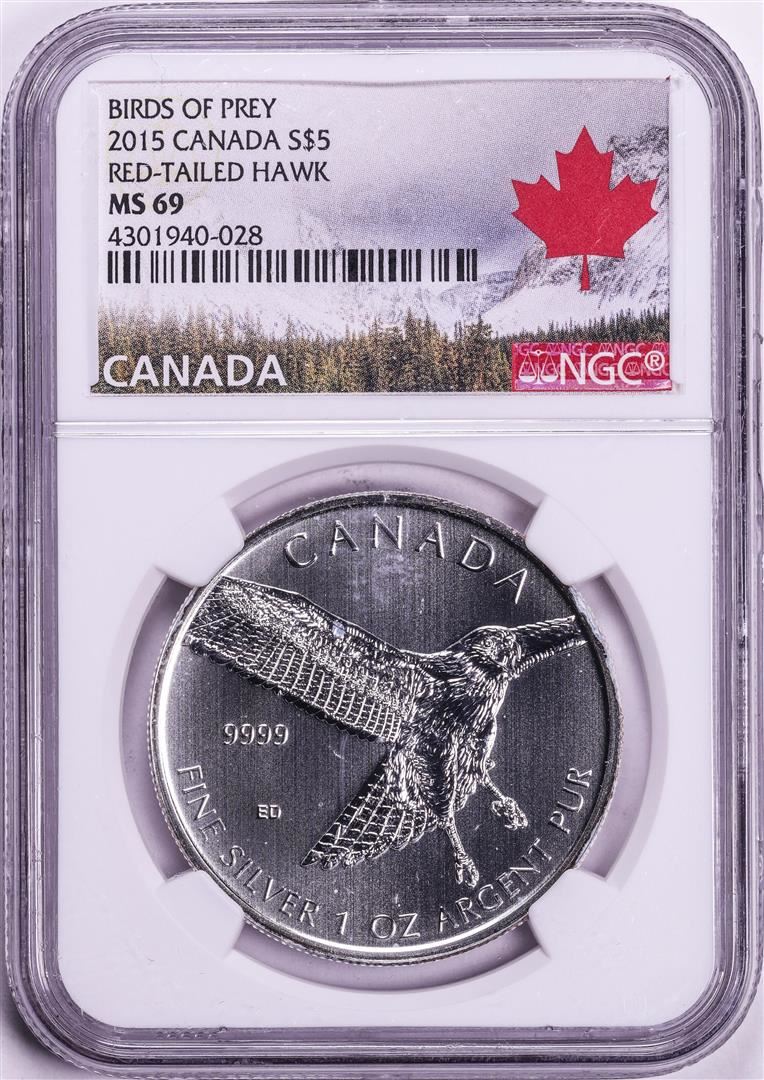 One 2015 Canada $5 Red-Tailed Hawk Silver Coin NGC MS69. NGC Certified.