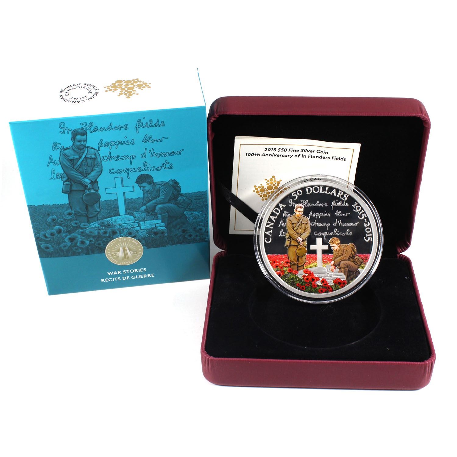 2015 Canada $50 5oz In Flanders Fields Centennial Fine Silver Coloured Coin (capsule lightly scratched). TAX Exempt