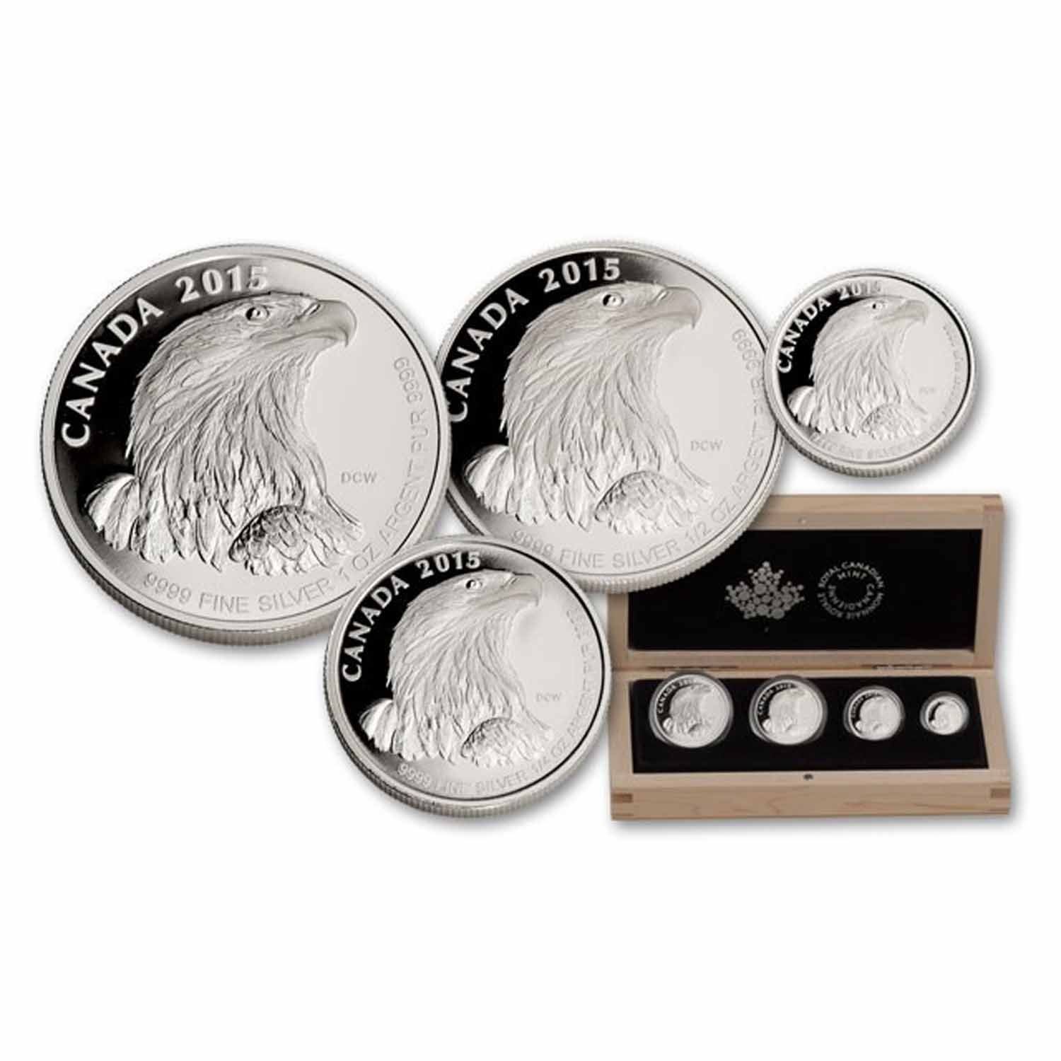 2015 Canada Bald Eagle Fractional Fine Silver 4-coin Set (Tax Exempt). Please note capsules contain small marks.