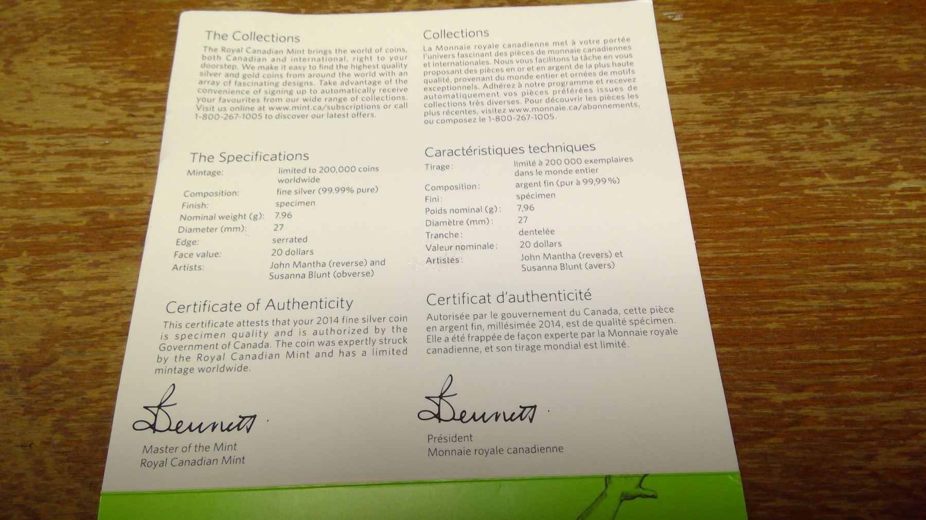2015 Canadian 20 Dollar coin, fine silver (99.99%)