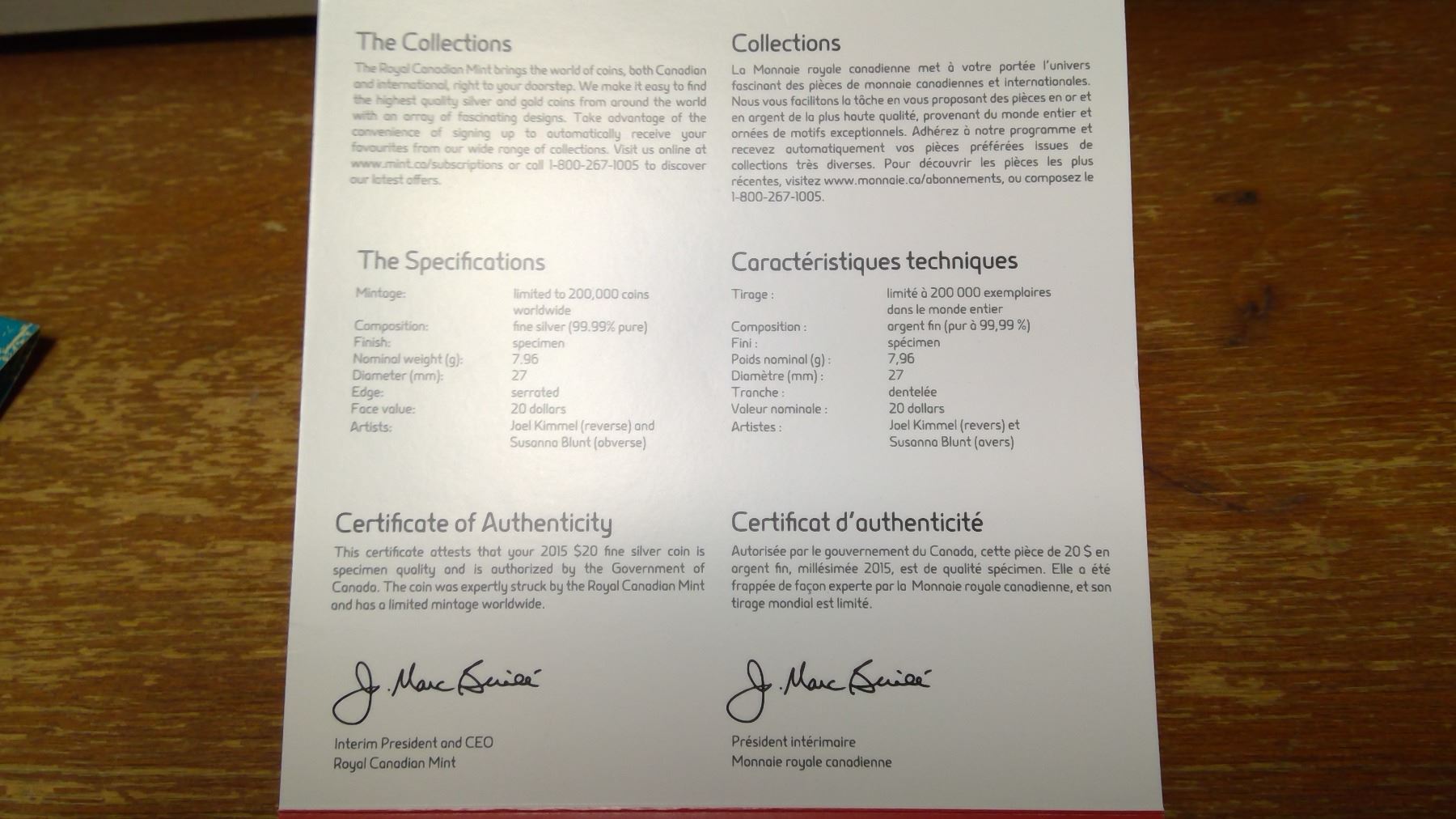 2015 Canadian 20 Dollar coin, fine silver (99.99%)