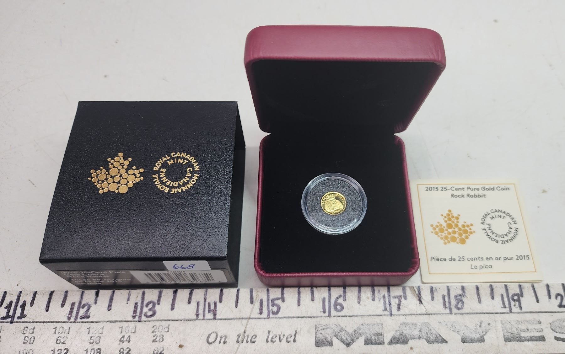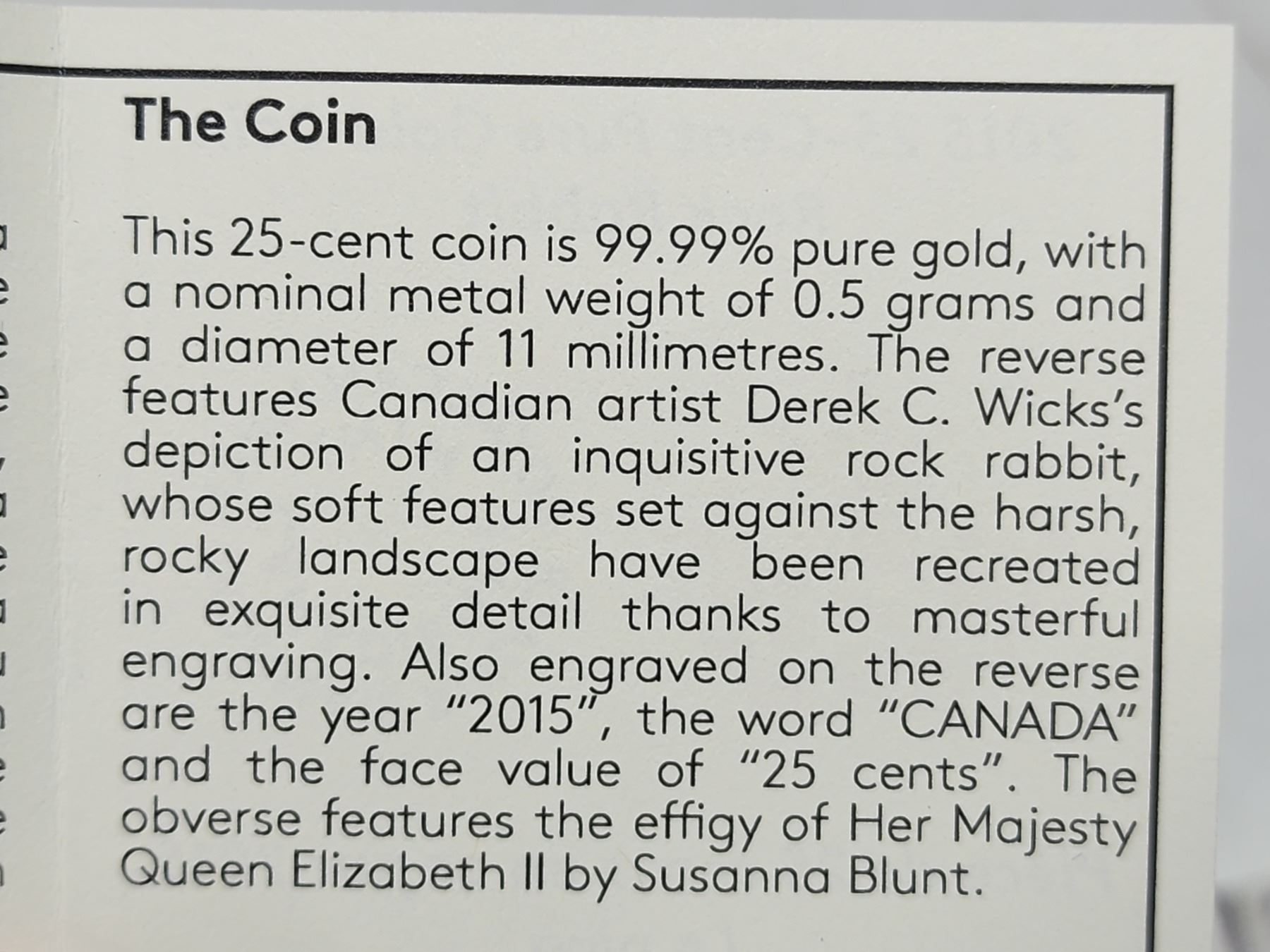 2015 Canadian 25 cent, 99.99% pure gold "Rock Rabbit" coin - 0.5g