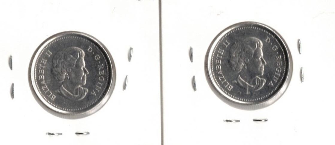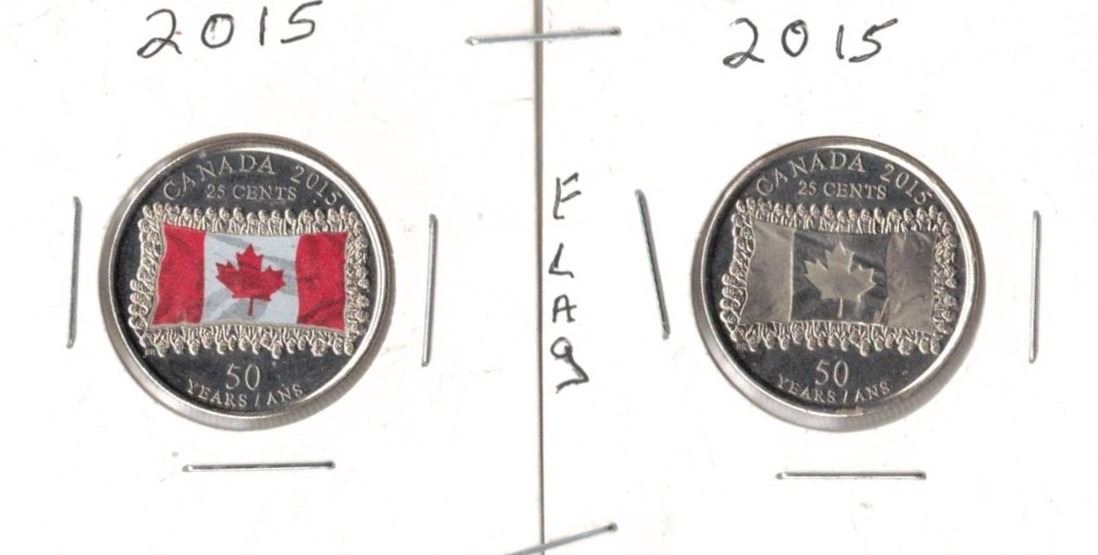 two versions of the 2015 Canadian 25-cent commemorative coin, issued to mark the 50th anniversary of the National Flag of Canada. The Royal Canadian Mint produced both a colored and a non-colored version for circulation.