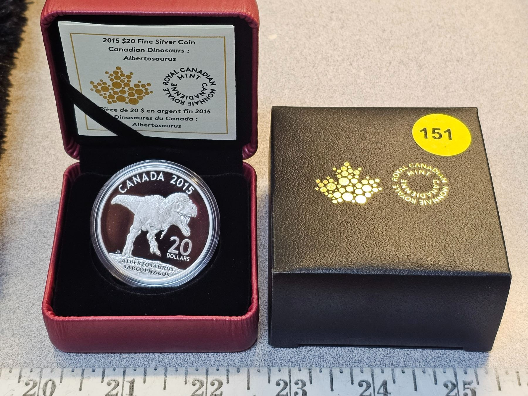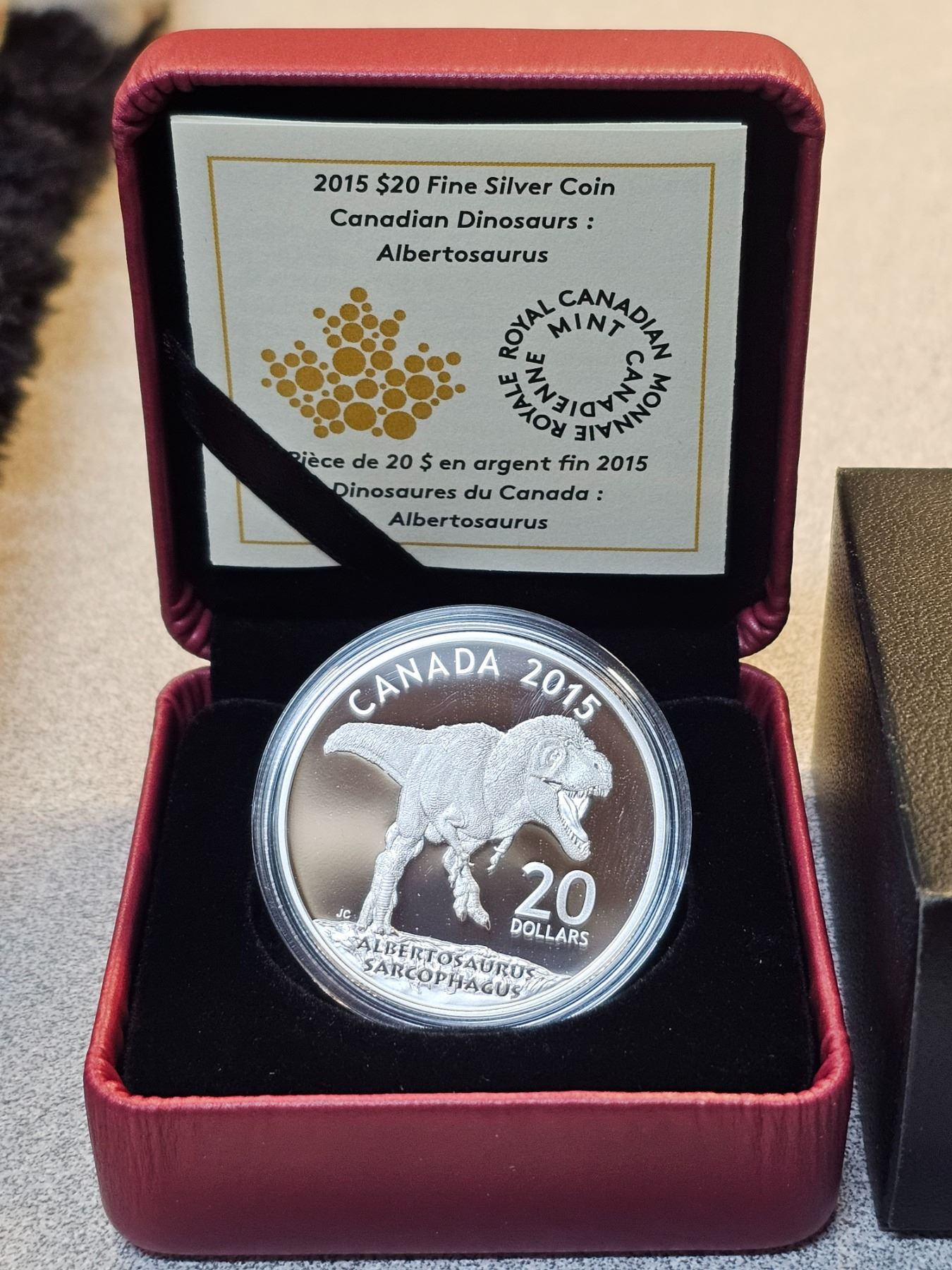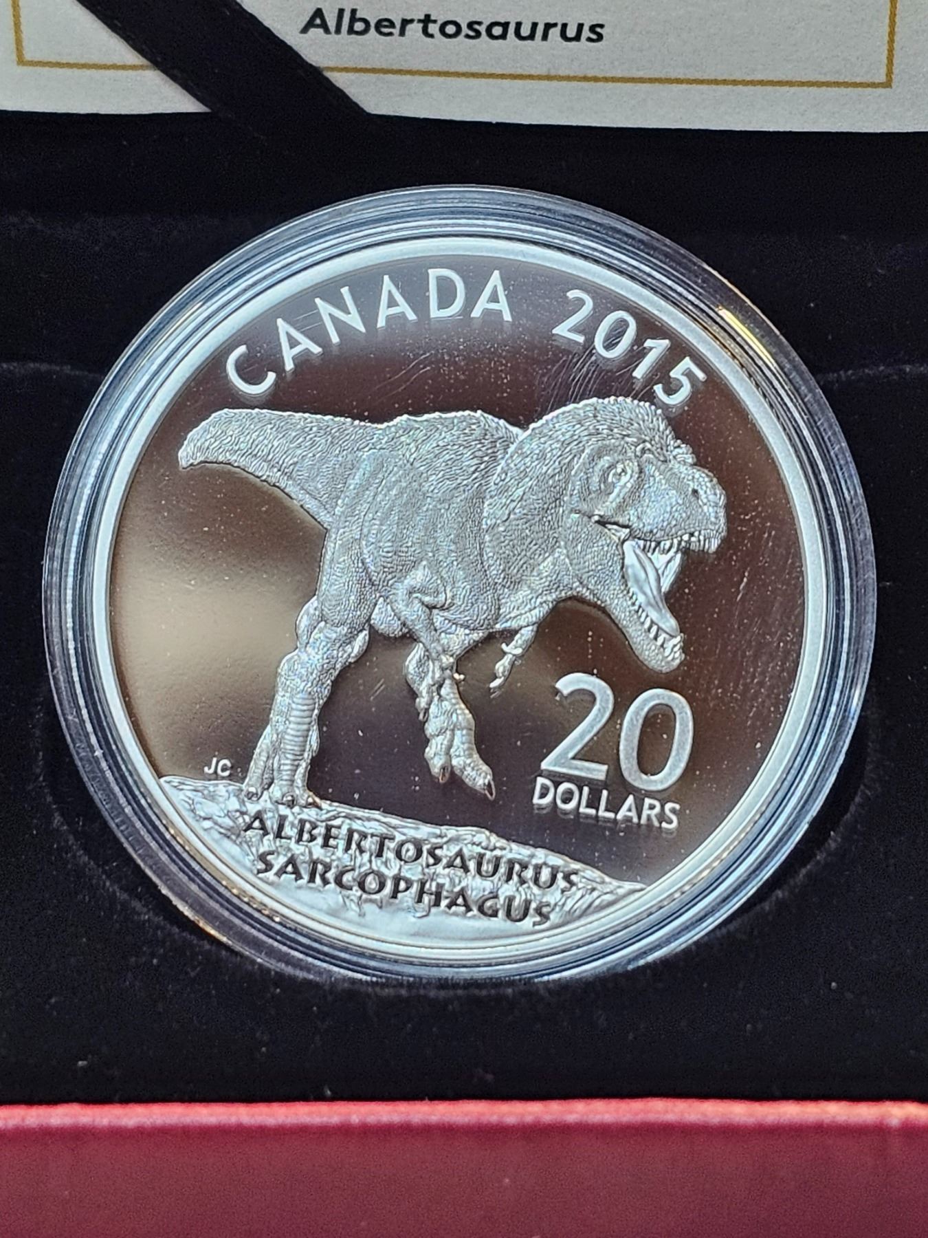 2015 Canadian Dinosaurs: Albertosaurus. Proof with Ultra Heavy Cameo. 99.99% pure Silver. Housed in its original Royal Canadian Mint case & box of issue, along with a Certificate of Authenticity.