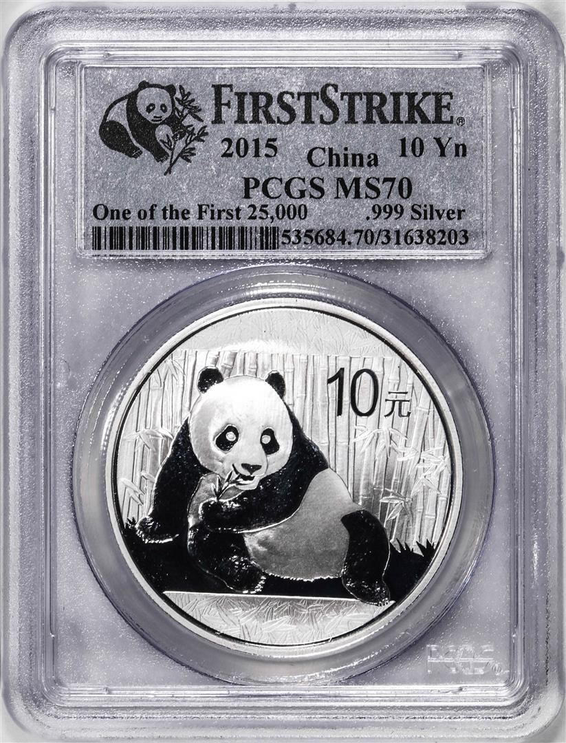 One 2015 China 10 Yuan Silver Panda Coin PCGS MS70 First Strike. PCGS Graded.