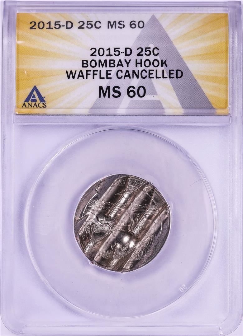 One 2015-D Bombay Hook ATB Quarter Waffle Cancelled Coin ANACS MS60. ANACS Certified.
