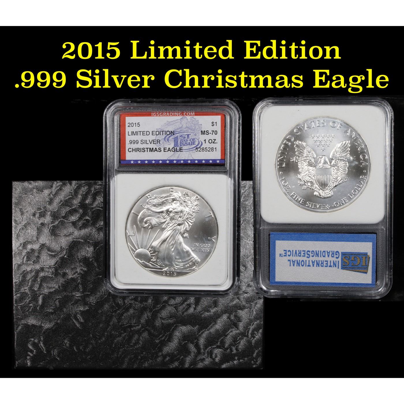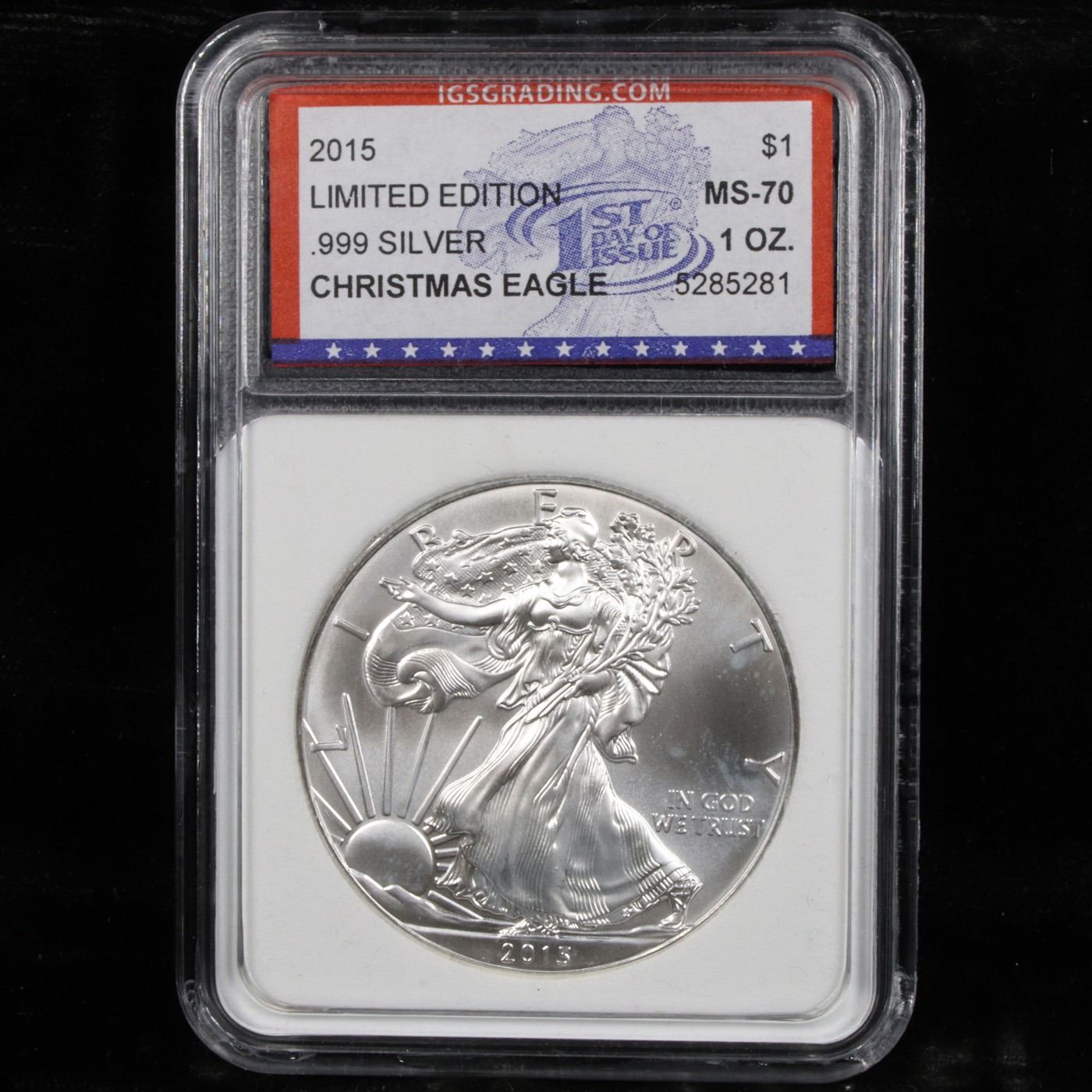 2015 Eagle, Limited Edition Christmas Eagle. 1st Day of Issue Silver Eagle Dollar $1 by IGS. 2015 Eagle, Limited Edition Christmas Eagle. 1st Day of Issue. Graded by IGSG