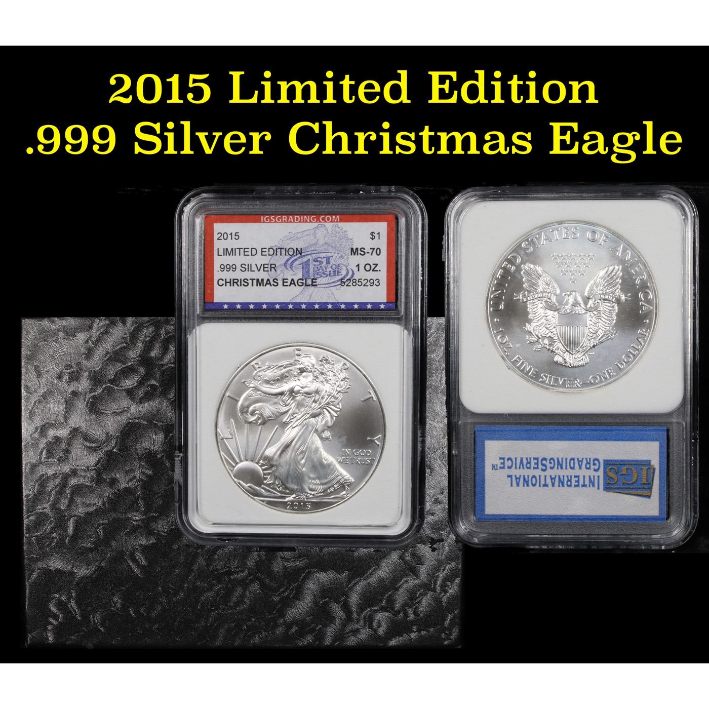 2015 Eagle, Limited Edition Christmas Eagle. 1st Day of Issue Silver Eagle Dollar $1 ms70, Perfection By IGS. 2015 Eagle, Limited Edition Christmas Eagle. 1st Day of Issue Graded by IGSG