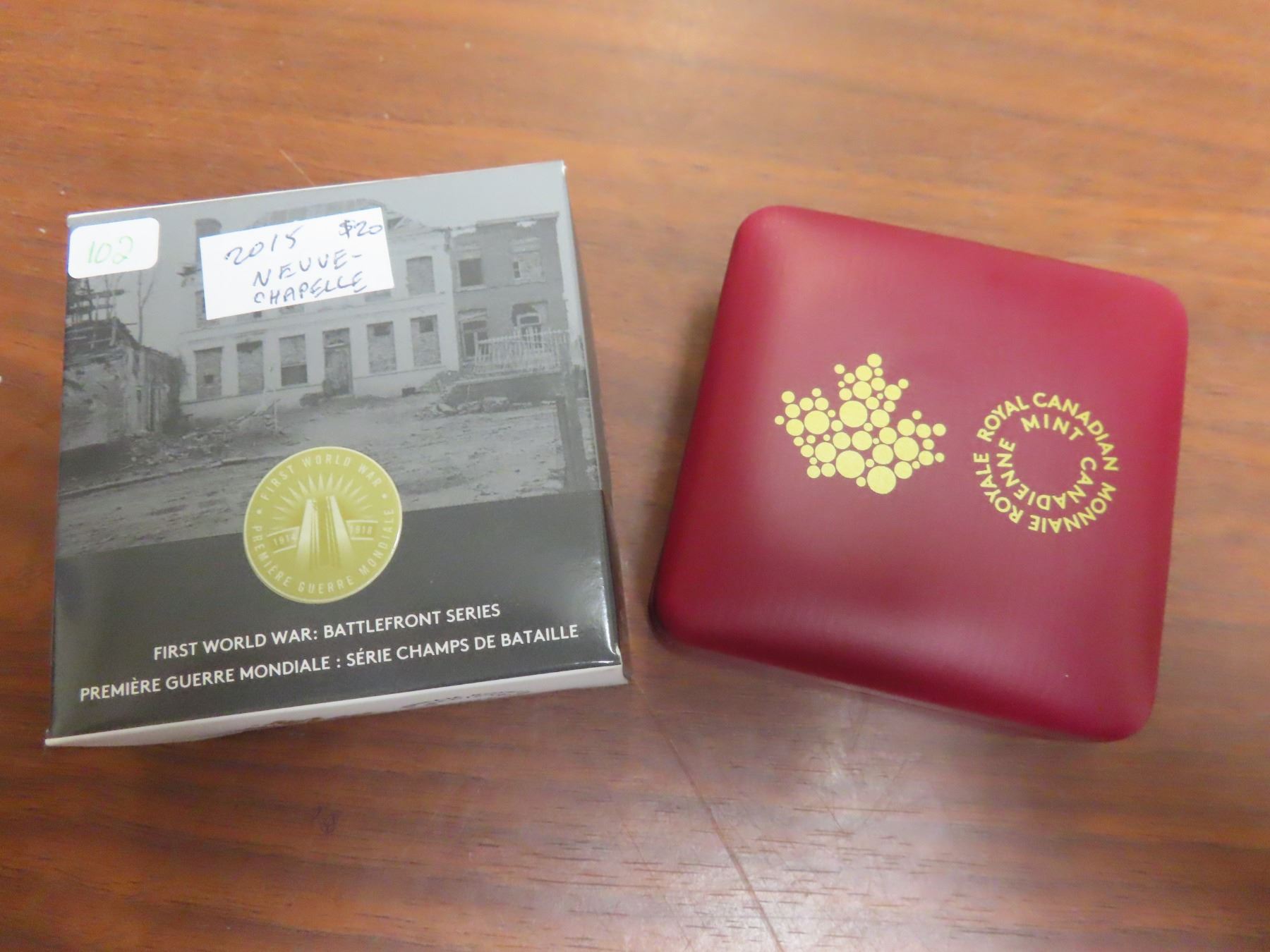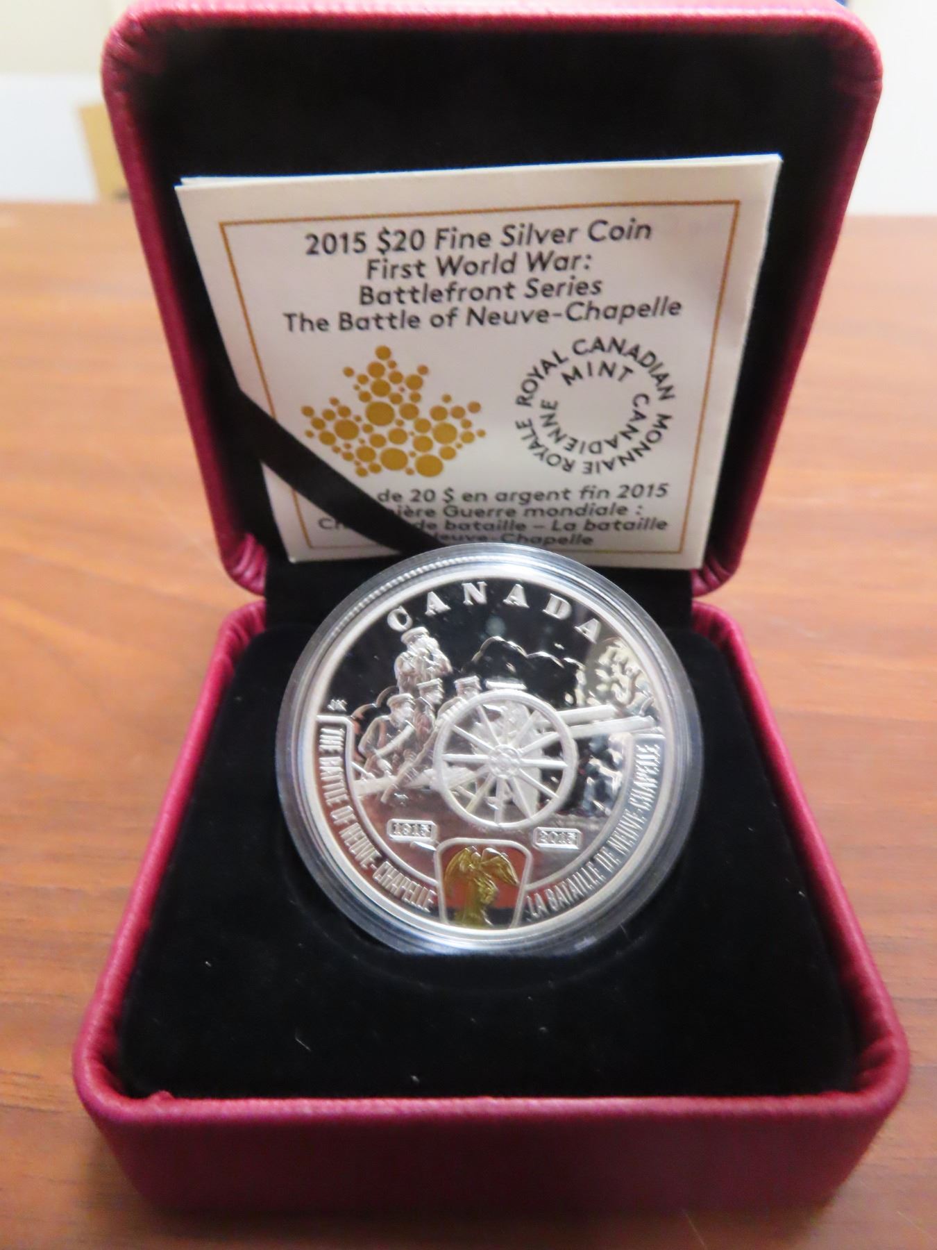 2015 First World War Battlefront Series: The Battle of Neuve-Chapelle $20. 99.99% pure Silver with gold plating. Proof with Ultra Heavy Cameo. Housed in its original Royal Canadian Mint case & box of issue. Includes Certificate of Authenticity.