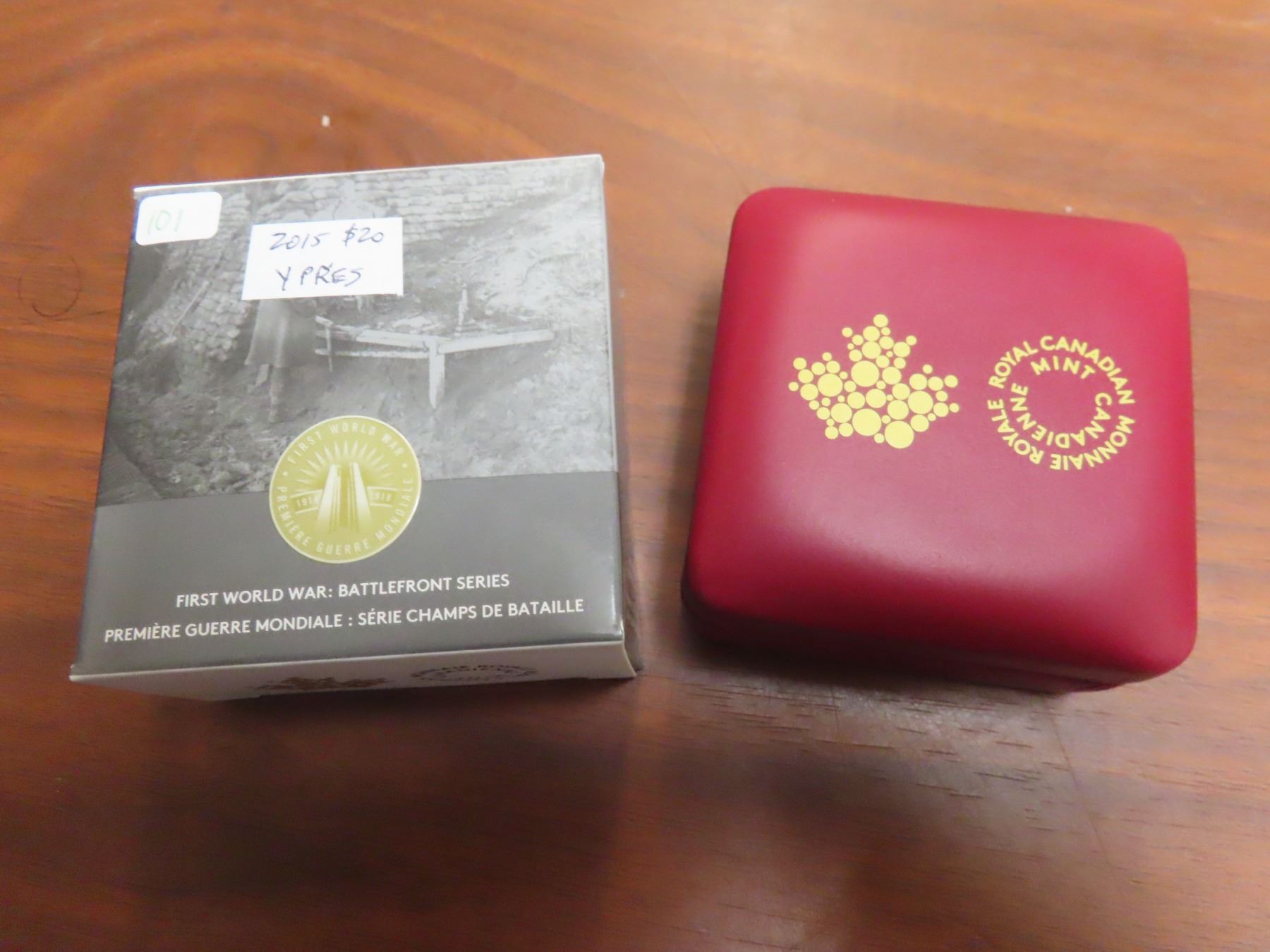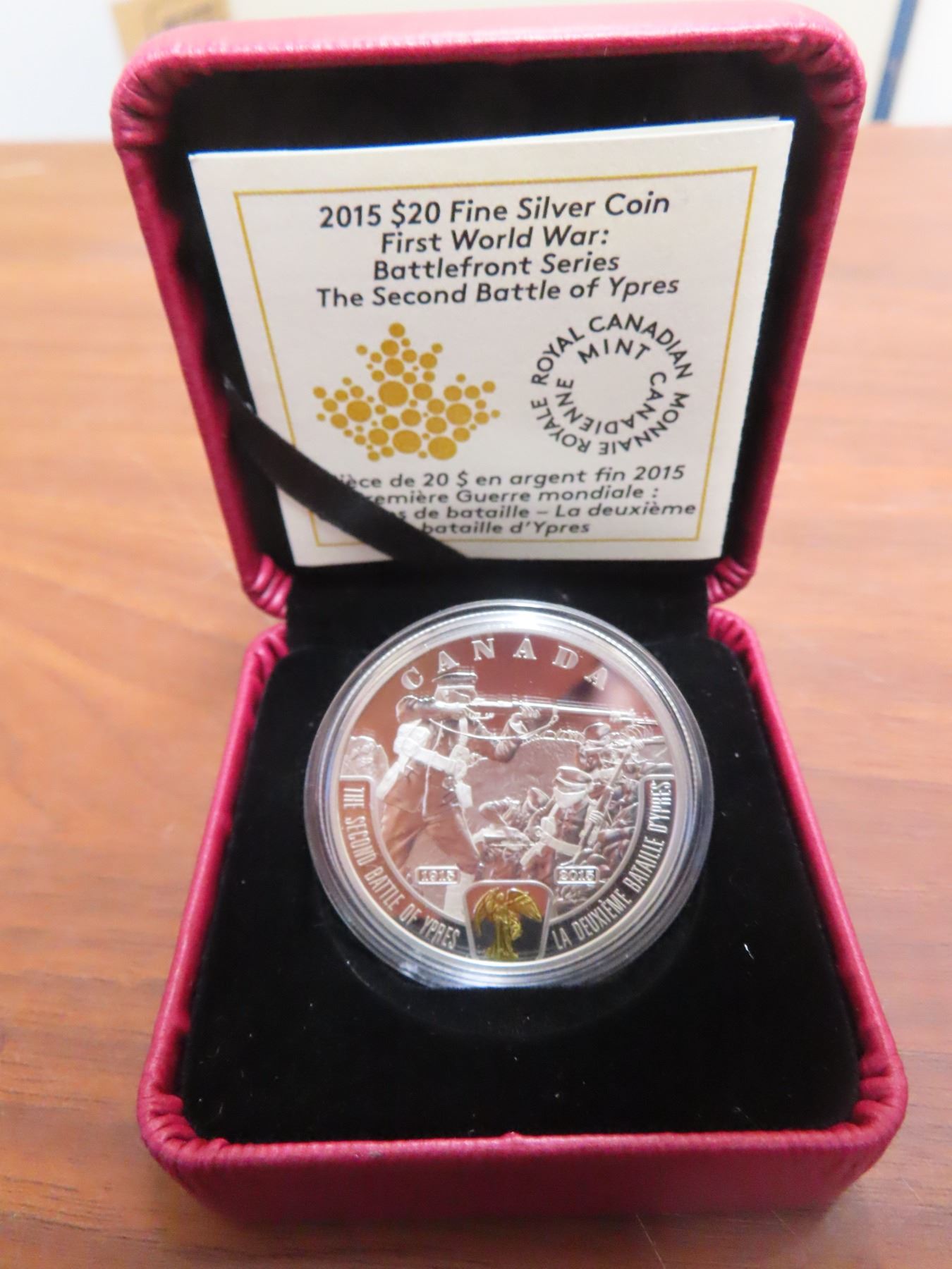 2015 First World War Battlefront Series: The Second Battle of Ypres $20. 99.99% pure Silver with gold plating. Proof with Ultra Heavy Cameo. Housed in its original Royal Canadian Mint case & box of issue. Includes Certificate of Authenticity.